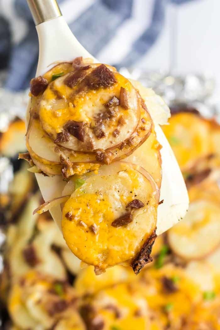 These easy, cheesy campfire potatoes are the perfect foil pack camping meal.