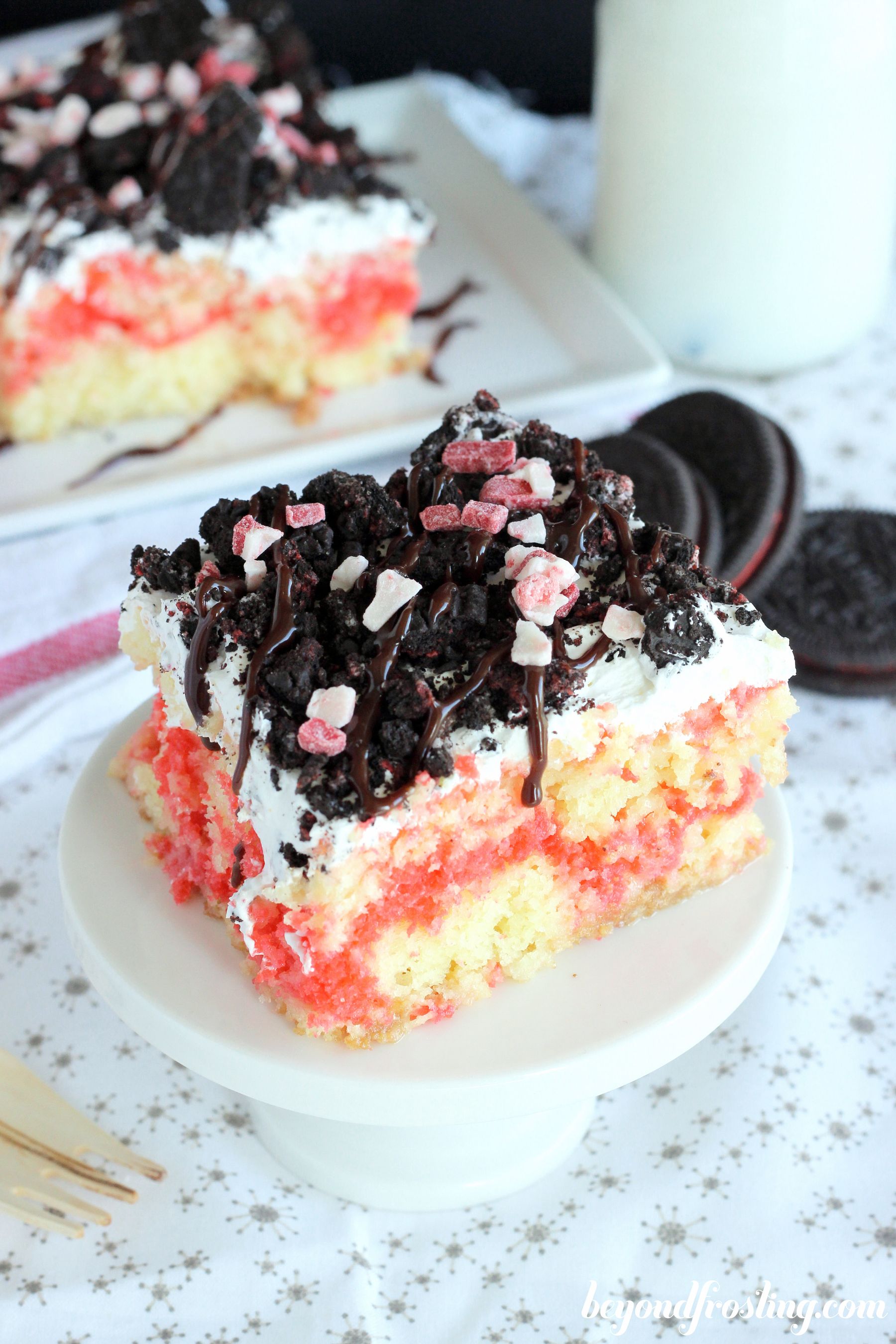 A peppermint poke cake with a red swirl that looks like a candy cane. Soaked in sweetened condensed milk and topped with whipped cream and peppermint Oreos.