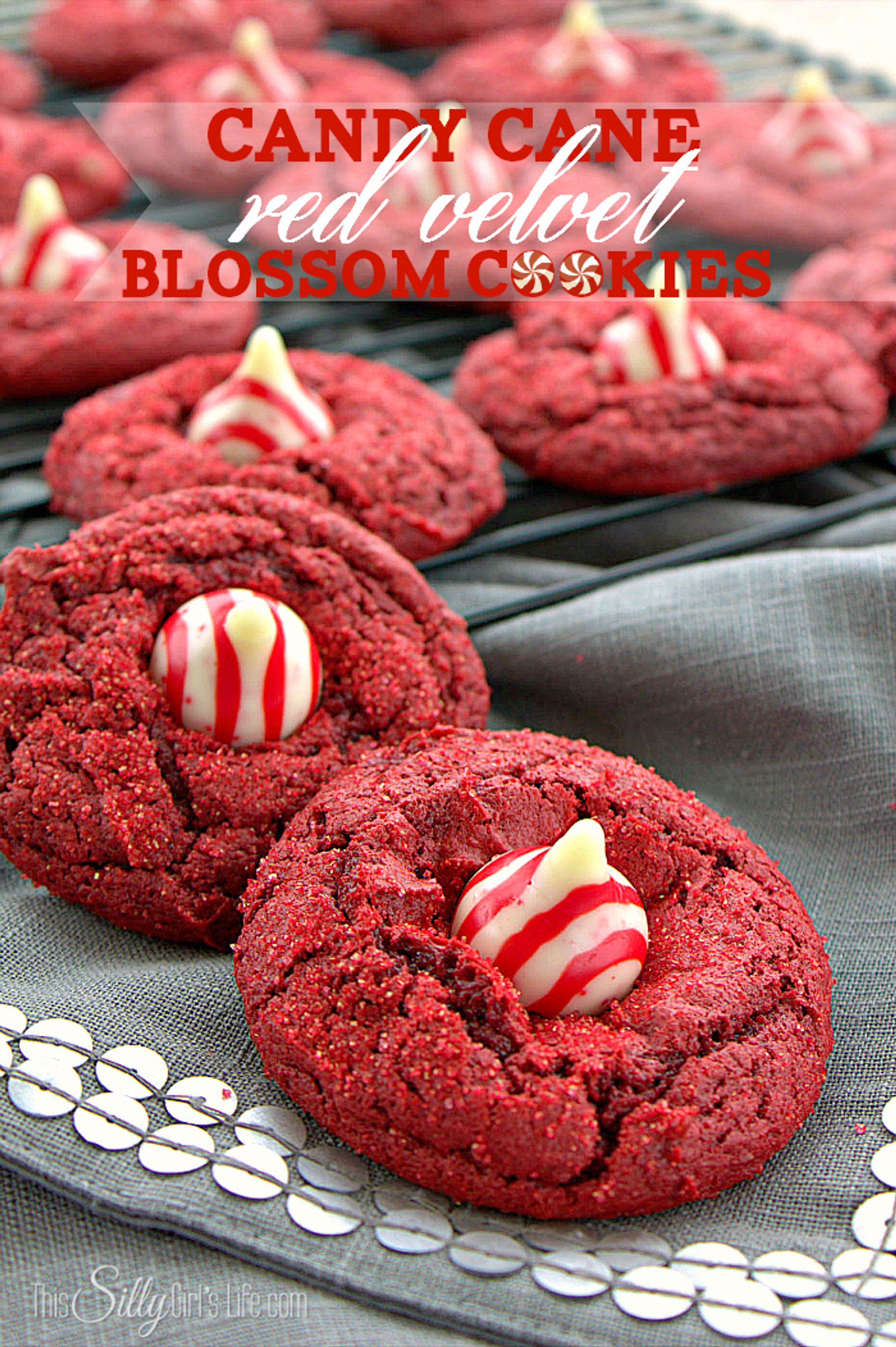 Candy Cane Red Velvet Blossom Cookies, soft and chewy cake mix cookies decorated with candy cane kisses!