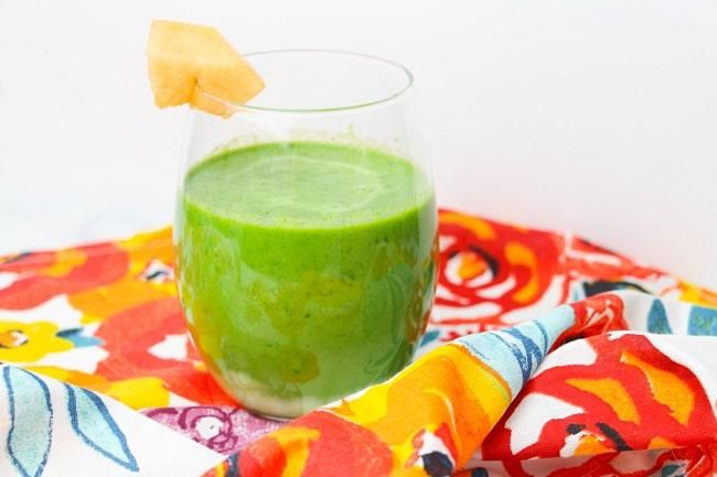 This Cantaloupe Green Smoothie is as delicious as it is healthy and easy to make. All you need are four simple ingredients and a few minutes to make this nutrient-dense meal in a glass. Cantaloupe is a great smoothie ingredient because it is dense and sweet, contributing both texture and natural sugar to a smoothie. In fact, it’s sweet enough, I thought I could get away with adding kale to it without chasing the kids away. And I did! You get the added benefit of getting a fulfilling breakfast or snack out of it too!