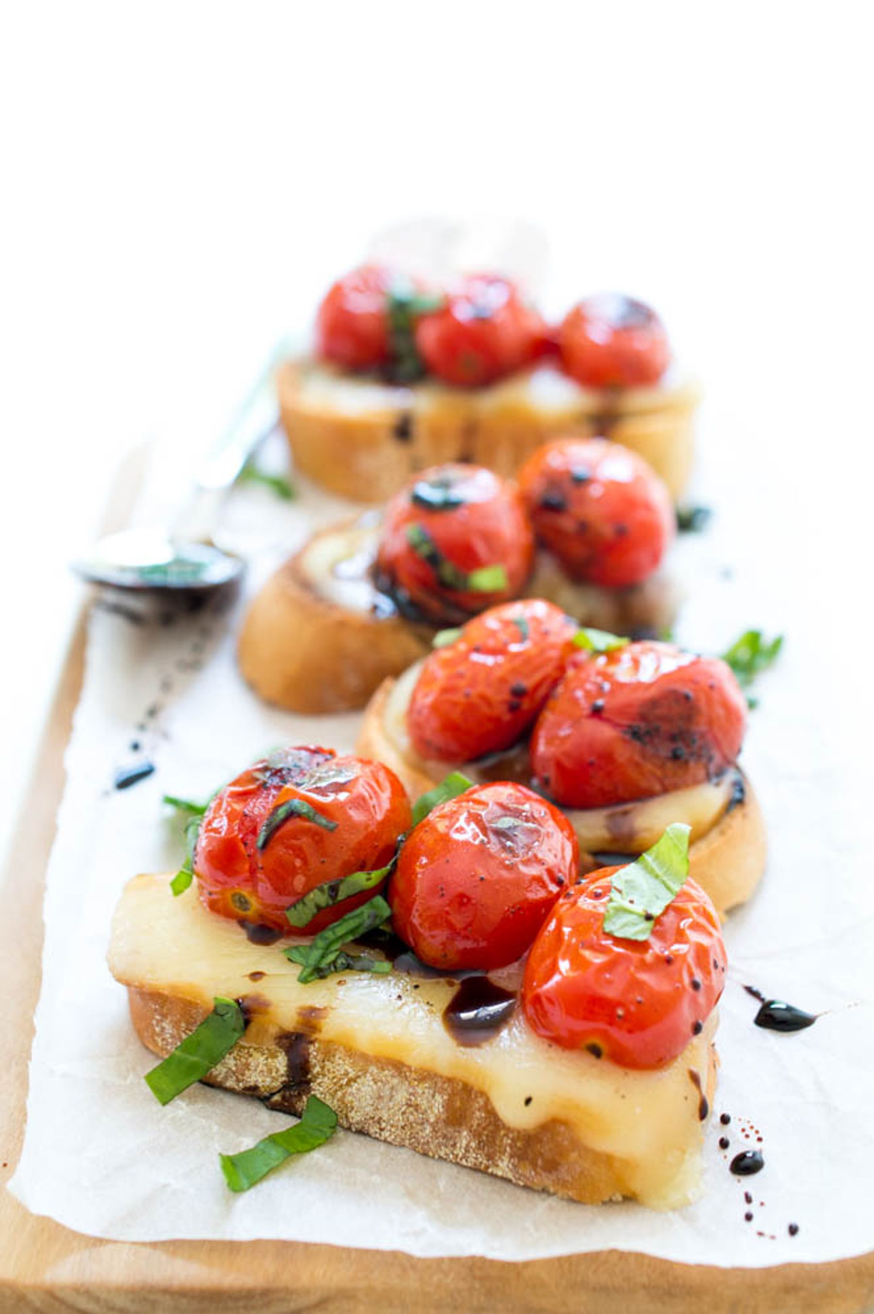 Crusty Italian Bread layered with homemade pesto, smoked mozzarella, blistered cherry tomatoes and a homemade balsamic reduction. Perfect for summer entertaining!