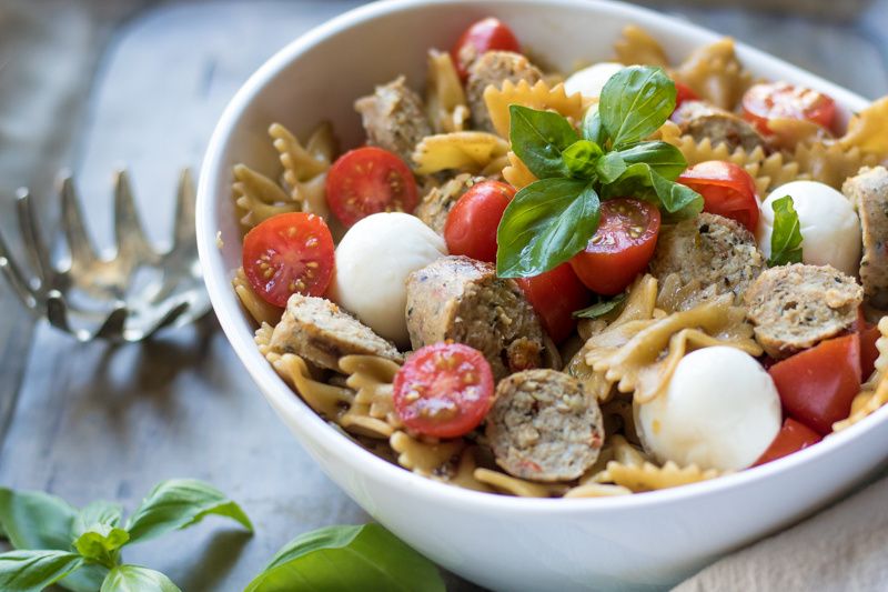 A delicious 30 minute pasta salad recipe filled with fresh mozzarella, cherry tomatoes, a homemade balsamic dressing and hearty chicken sausage. This pasta salad is perfect for a picnic or 30 minute weeknight meal.