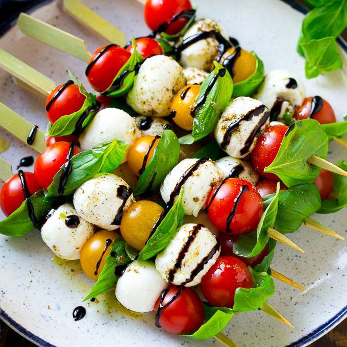 These caprese skewers combine tomatoes with basil, mozzarella, olive oil and balsamic for an appetizer that's both easy and impressive!