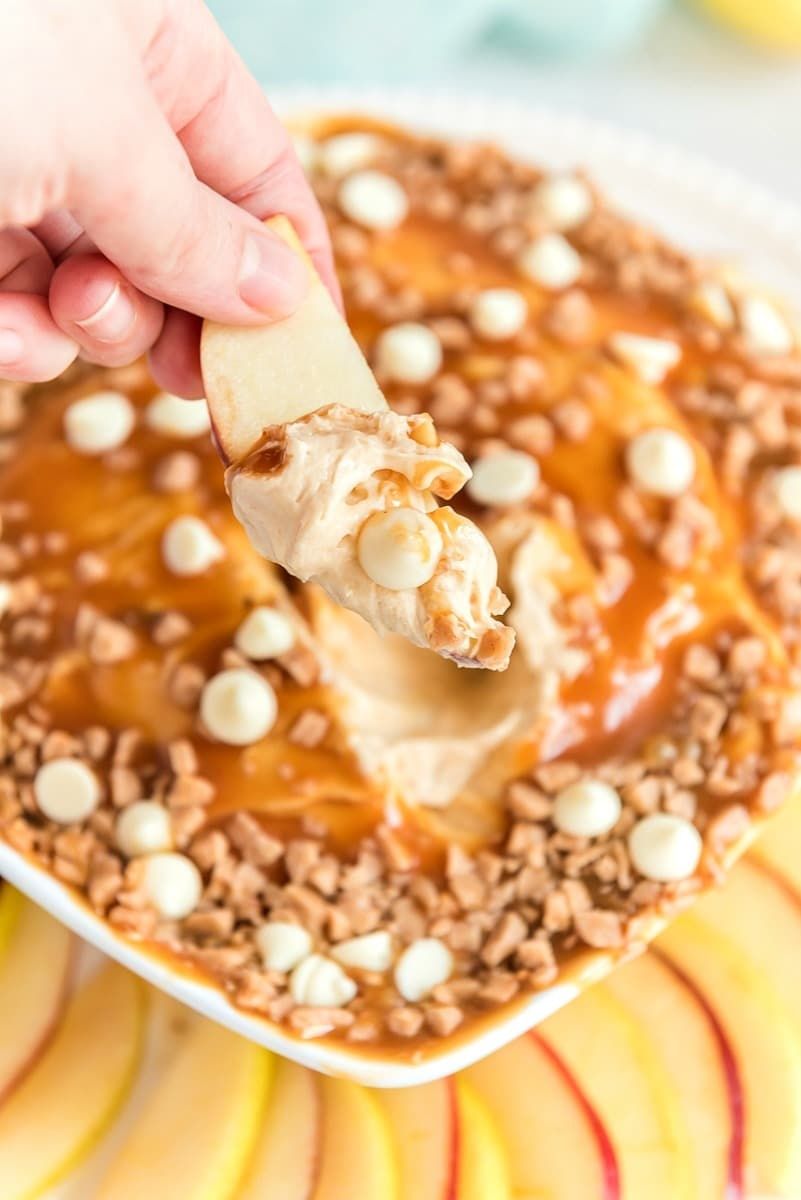 This caramel apple dip is made with cream cheese, caramel, toffee bits, white chocolate chips and Cool Whip. Serve it with apples, your favorite fruit or cracker.