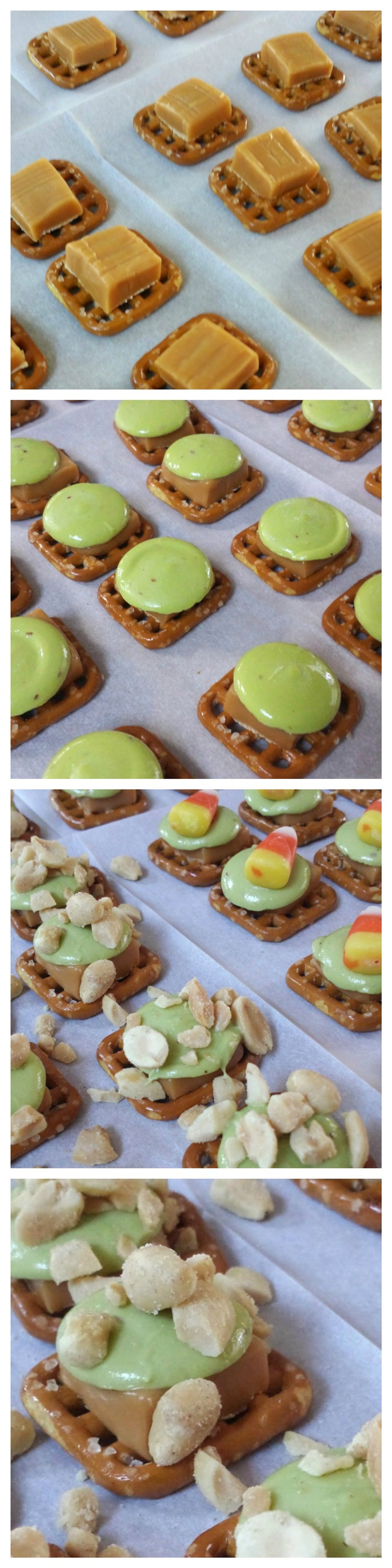 Preheat Oven to 350F Line a cookie sheet with the pretzels. Unwrap, and cut the caramels in half; place half of caramel on each pretzel. Place in oven for 5 minutes. Place a caramel apple candy melt on each...
