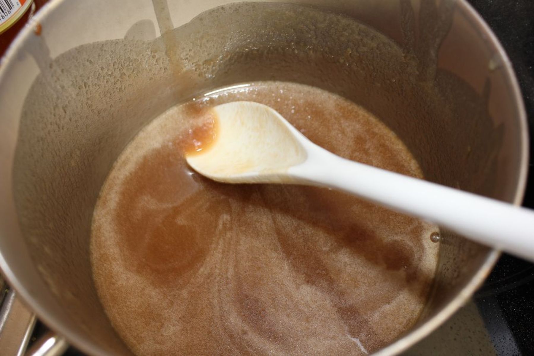 Remove from heat and whisk in baking soda and vanilla. It will bubble up a lot, which is why...
