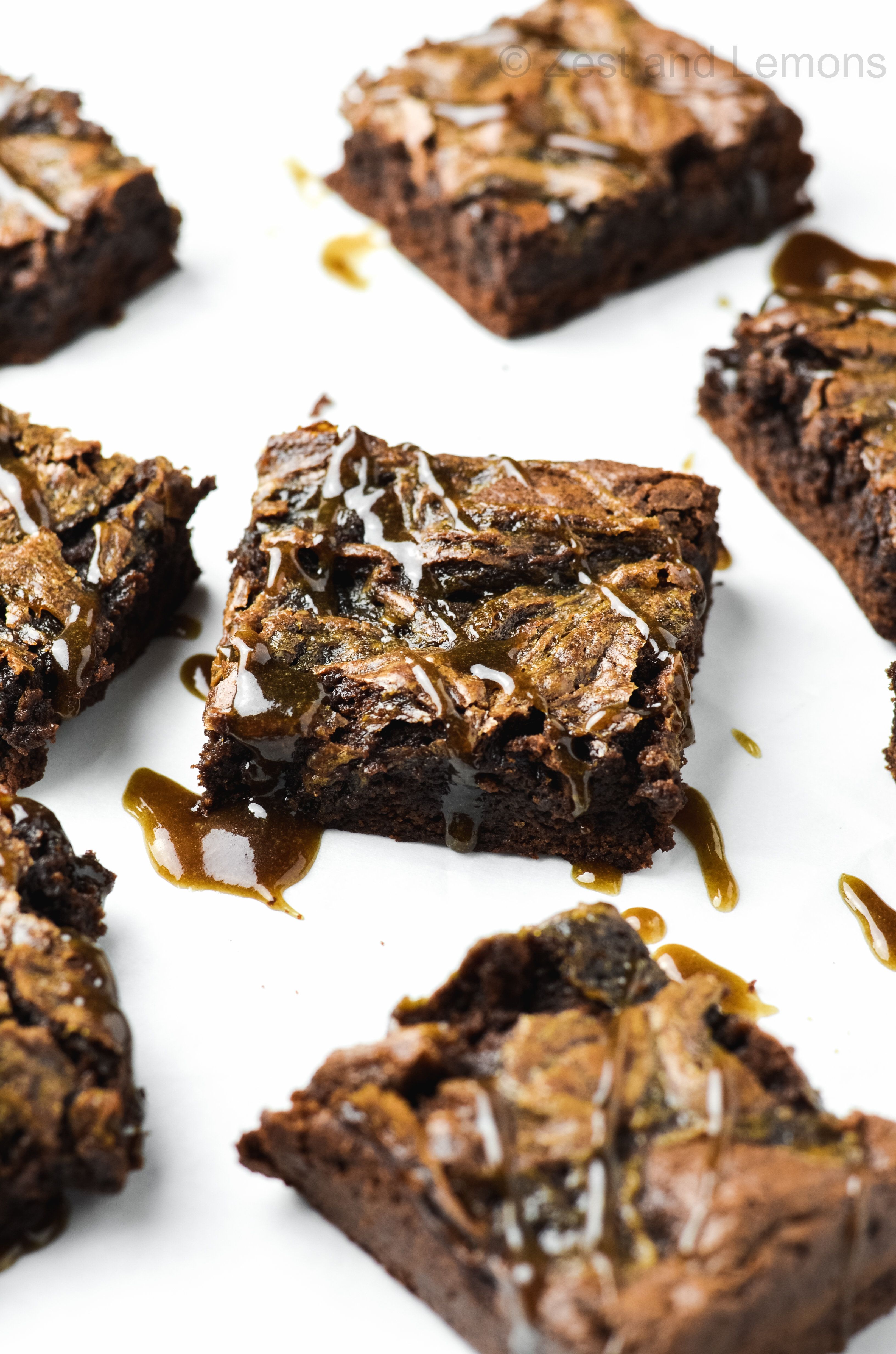 These caramel gluten free brownies are swirled with a homemade dairy-free coffee caramel sauce. Fudgy, chewy, and slightly gooey, you need these gluten free brownies in your life!