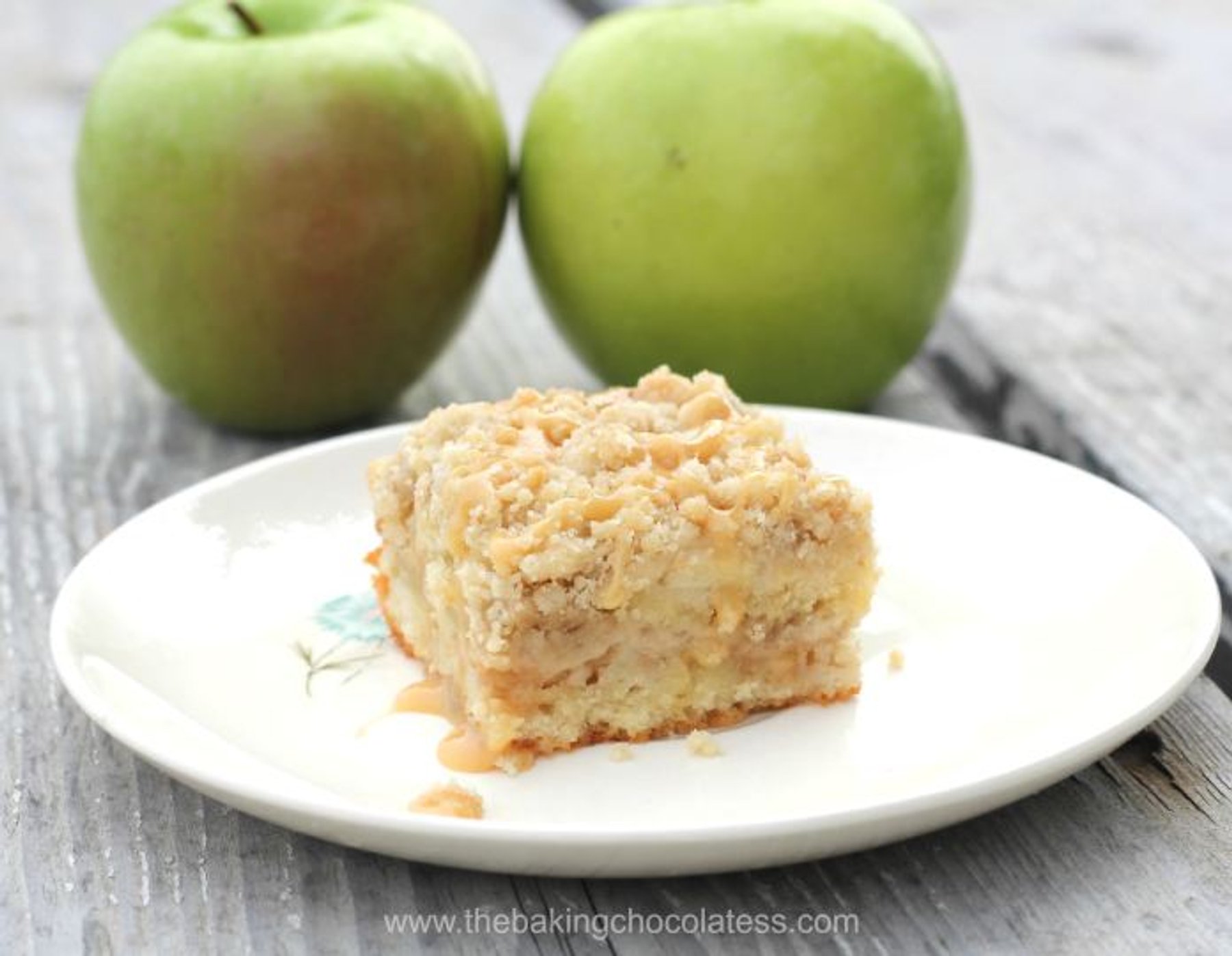 Apple Crumble Coffee Cake In a large bowl, cream together butter and honey for about 2 minutes. Add eggs and beat well, then add Greek yogurt and vanilla and continue beating until combined. In another bowl, stir together the flour, baking soda, salt, and baking powder and add to the butter mixture, stir until just combined. Spread half the batter at the bottom of the pan. Layer will be very, very thin, but will rise in the oven, so don\\\'t freak out! :) Place the 2/3rds of the apple chunks evenly over the batter, then spoon 1/2 cup caramel dip over the apples (warm up in microwave makes it easier) then sprinkle 1 cup of the crumbles over the caramel and apples. Spread the remaining batter over the crumbles, with a butter knife as best as you can, then add the rest of the apples and sprinkle the rest of the crumbles on top. Bake 35-40 minutes. Let cool on baking rack in pan.