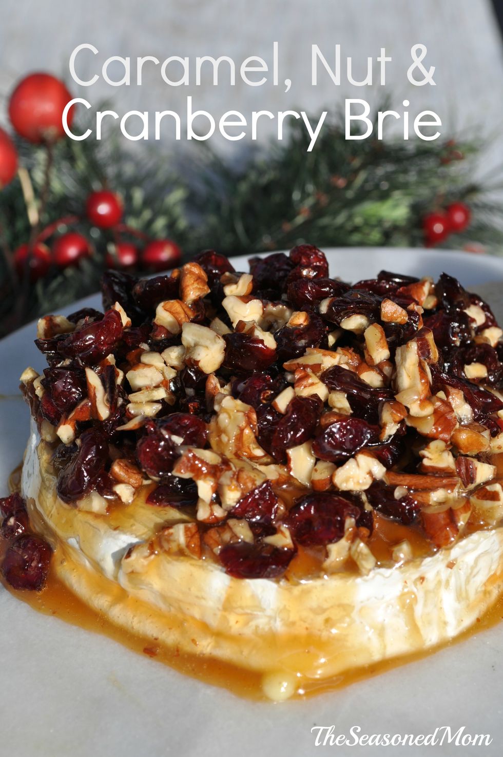 In a separate bowl, combine caramel sauce, cranberries, and pecans. Spread over Brie.