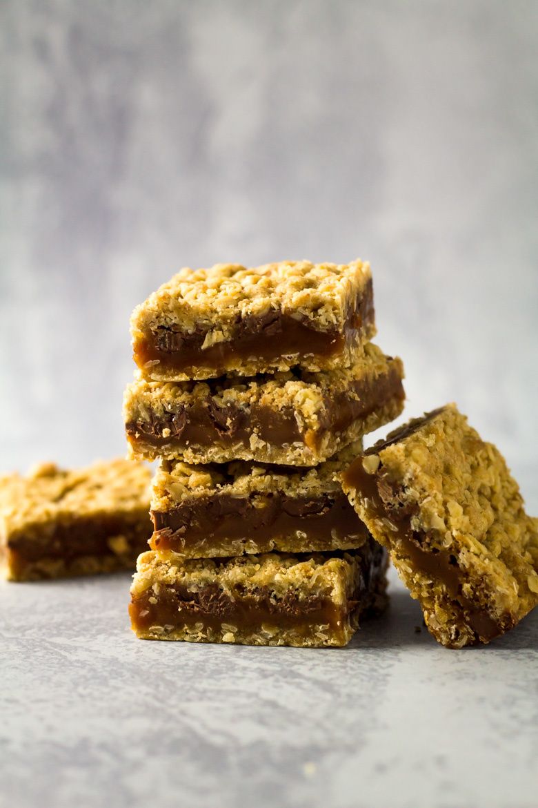 Deliciously chewy oat bars that are made with an oaty, buttery crumb, and filled with a thick layer of caramel and chocolate chips. The perfect sweet treat!
