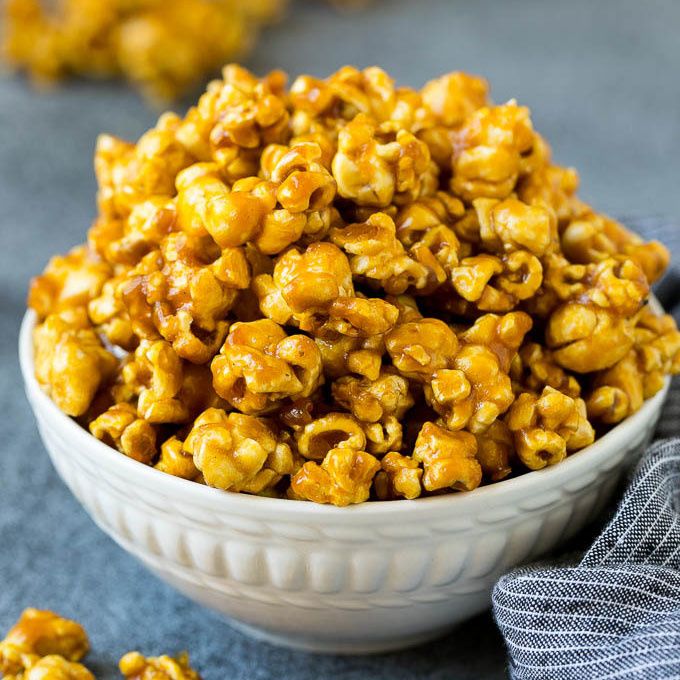 This homemade caramel popcorn is lightly salted popcorn tossed in a homemade caramel sauce, then baked to perfection. The best caramel corn you'll ever eat, and it's perfect for parties and gift giving!