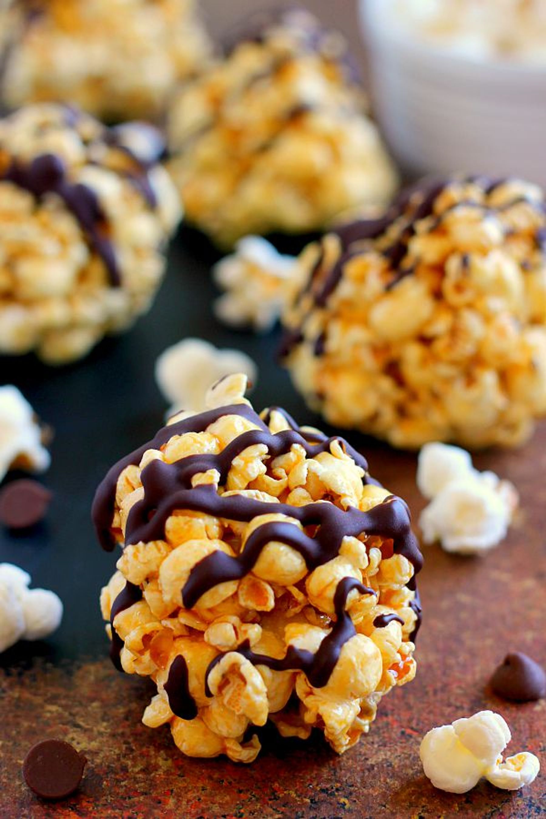These Caramel Popcorn Balls combine fresh popcorn, caramel sauce, marshmallows, and dark chocolate. This easy snack is perfect to munch on when you need to satisfy those sweet and salty cravings!