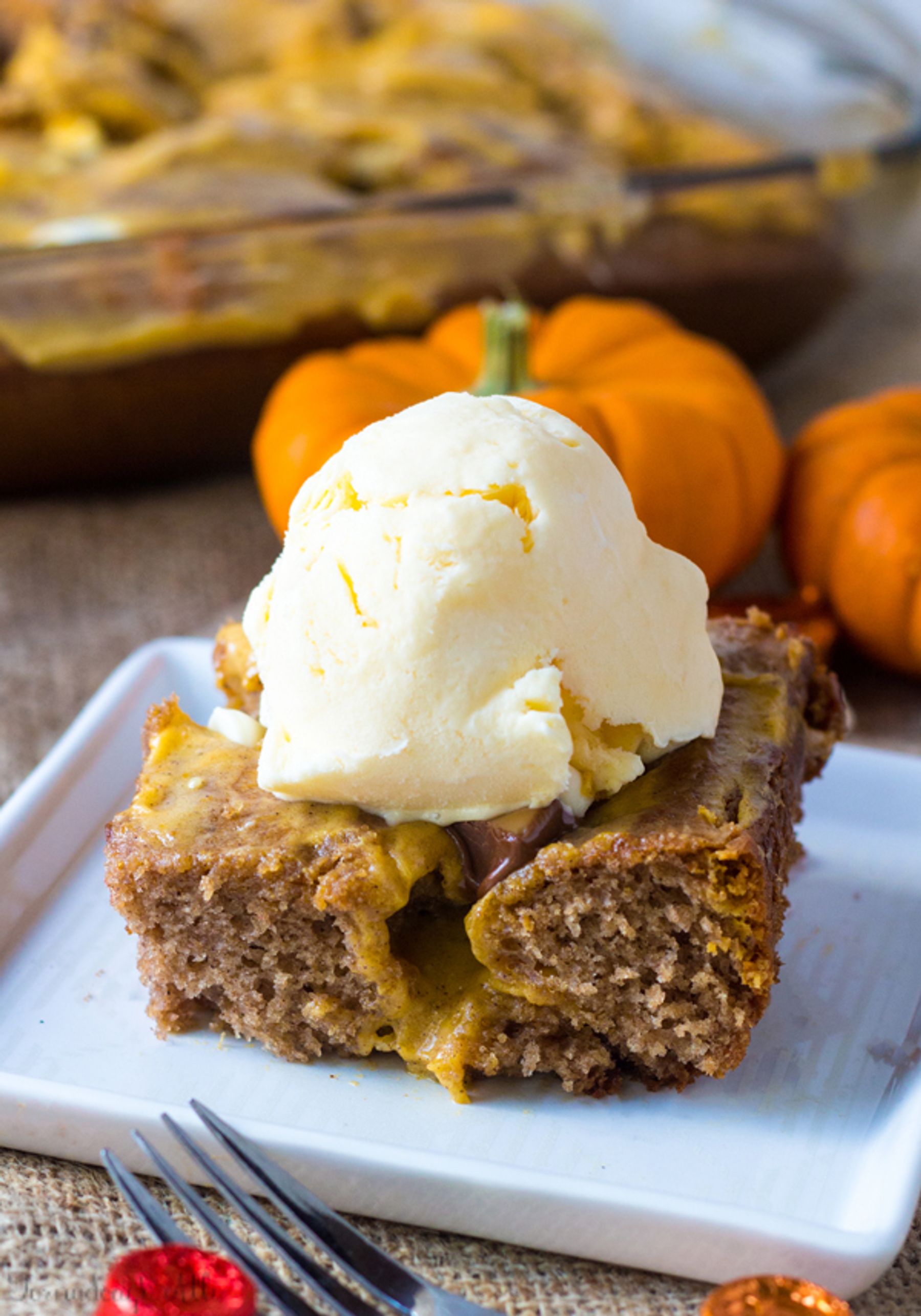 Spice cake is swirled with gooey pumpkin center and studded with white chocolate chips and rolos making this cake ooey gooey and delicious!