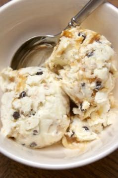 Cheesecake ice cream loaded with toffee bits, mini chocolate chips and caramel.