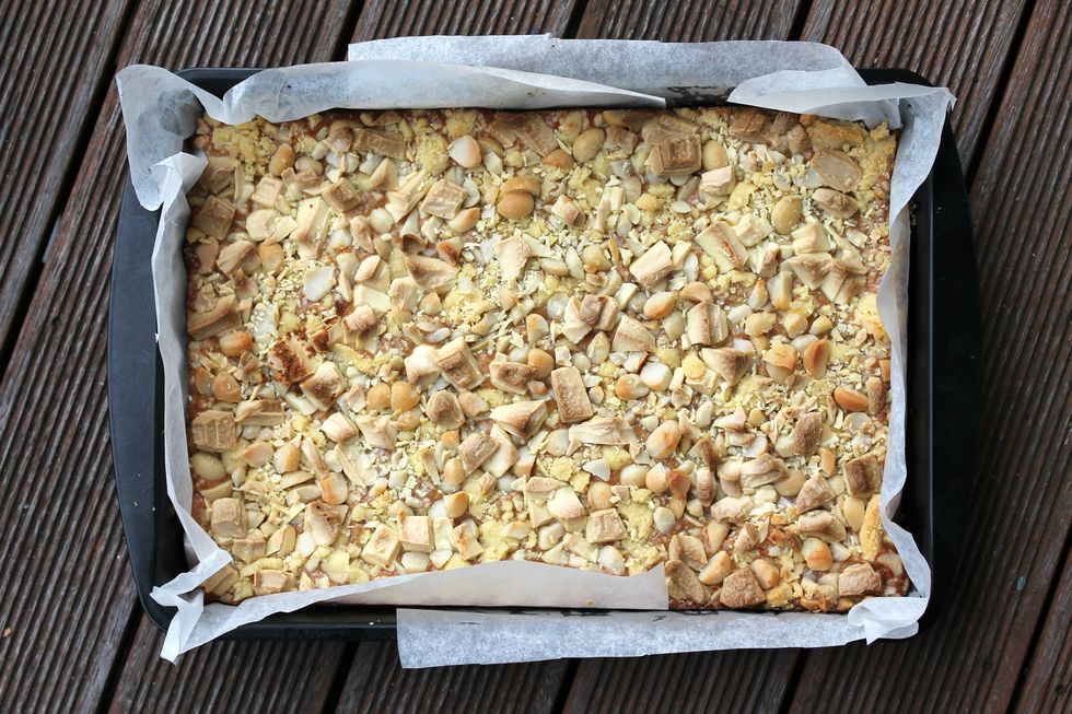 Delicious shortbread base with a soft caramel filling topped with white chocolate and macadamia nuts