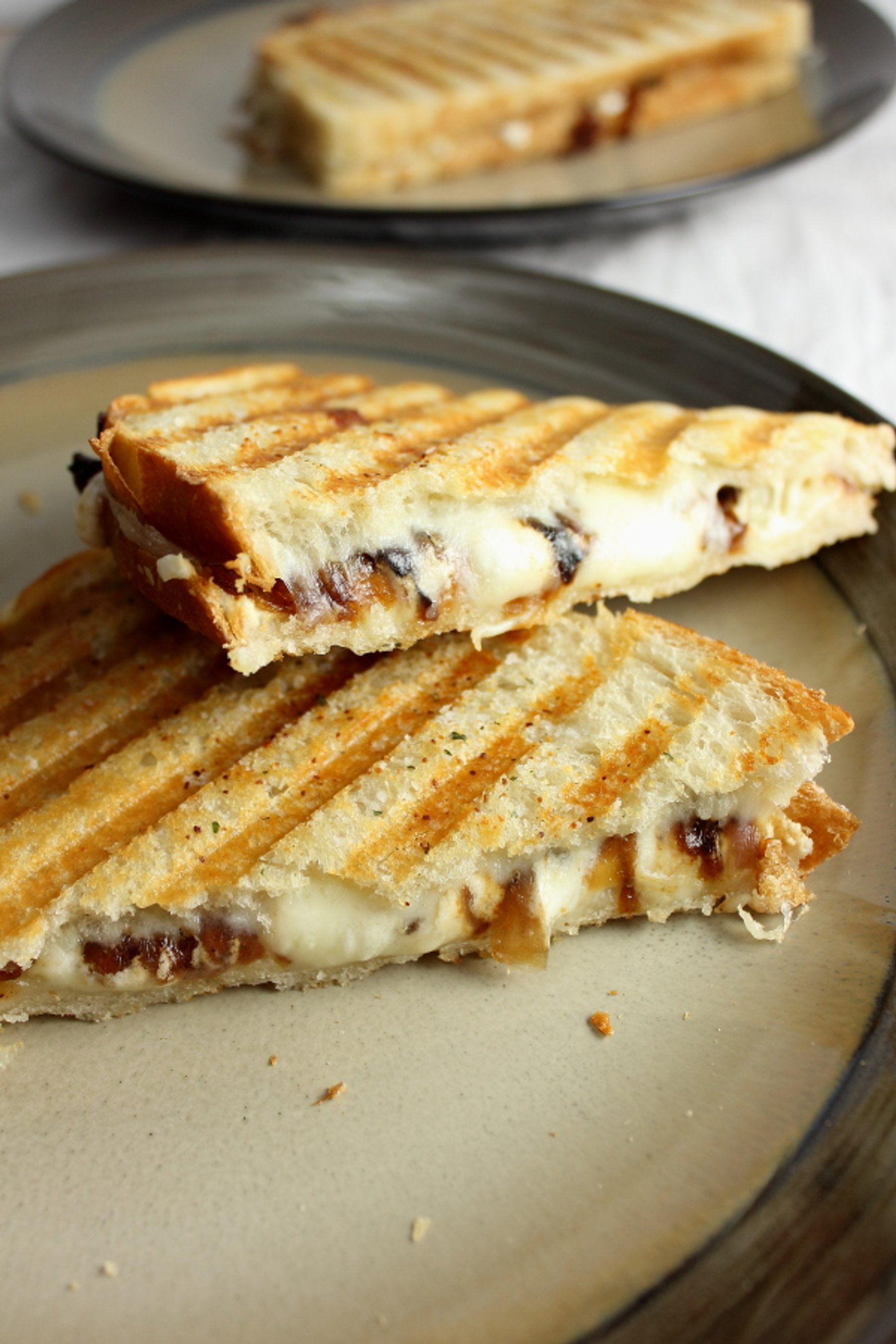 2.Lay 2 slices of provolone on each piece of bread. Evenly distribute the goat cheese and caramelized onions. Close the sandwich.