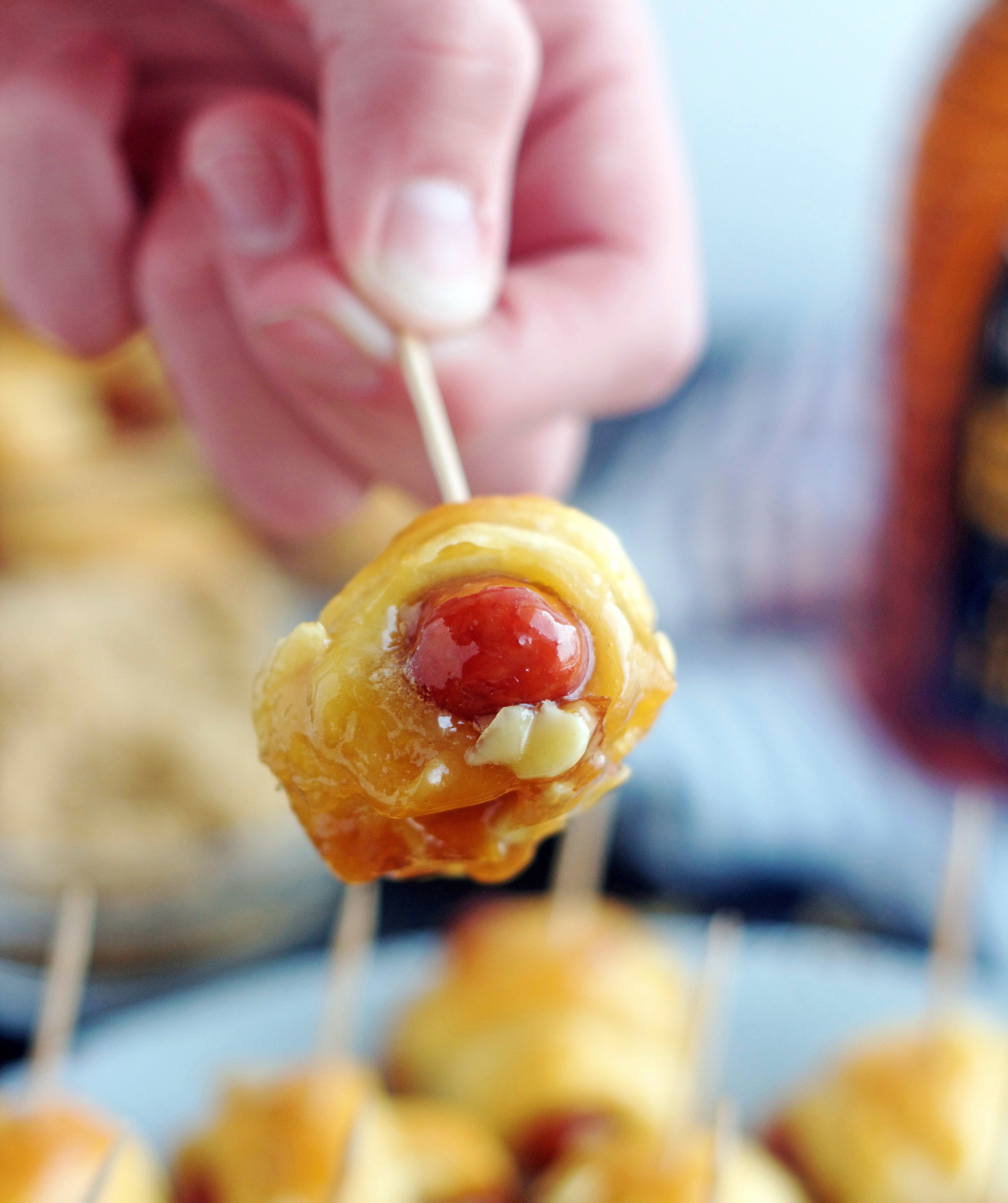 Mini smokies wrapped in crescent roll strips and then baked in a sweet and buttery sauce. These Caramelized Pigs in a Blanket are insanely good and the perfect appetizer for any occasion!