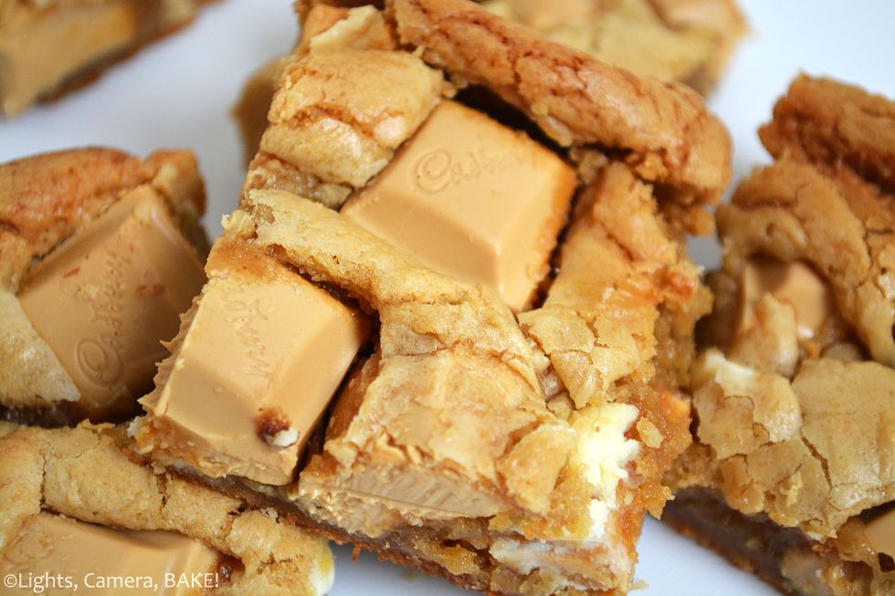 Caramilk Bars. These are chewy, sweet and gooey. They have a little caramel flavour with a few pieces of white chocolate thrown in to create the flavour of Caramilk in cookie bar form.