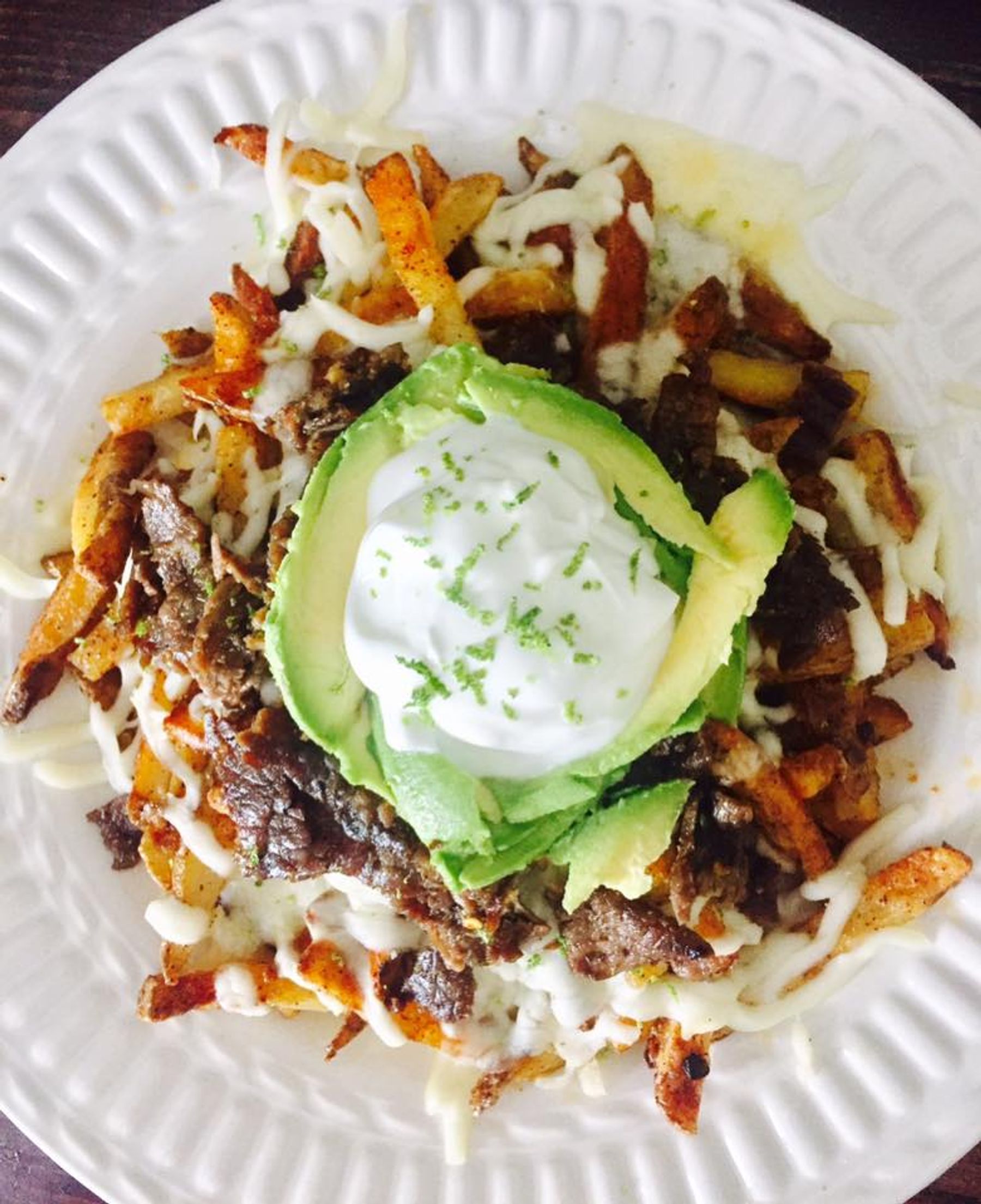 Homemade french fries with delicious, Mexican flavored steak and favorite Latin American sides on top!