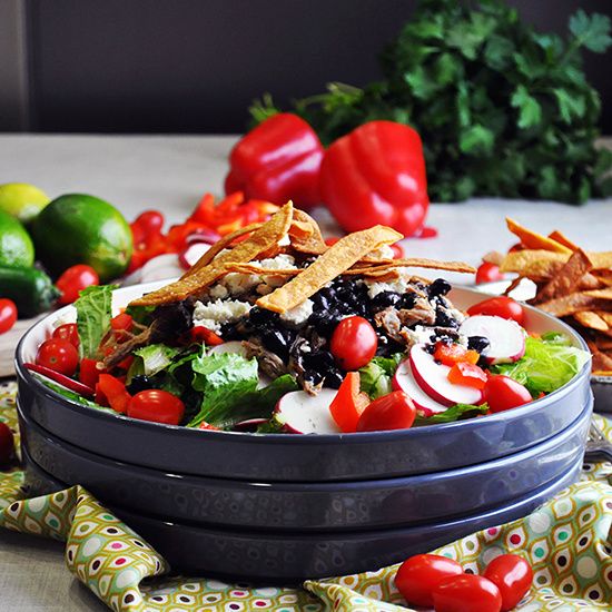 This taco salad with pork carnitas is one of my favorite ways to eat my veggies. A pile of greens, red bell peppers, radishes, and cherry tomatoes tossed in salsa vinaigrette, topped with slow simmered black beans, pork carnitas, cheese, and fried tortilla strips.