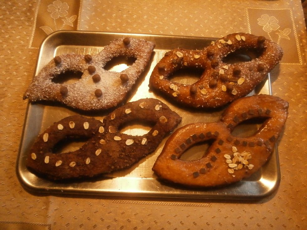 6. Liquor the masks with it. While they are still drie, put on the top chocolate flakes and sprinkle with coconut flour to get imaginative masks.