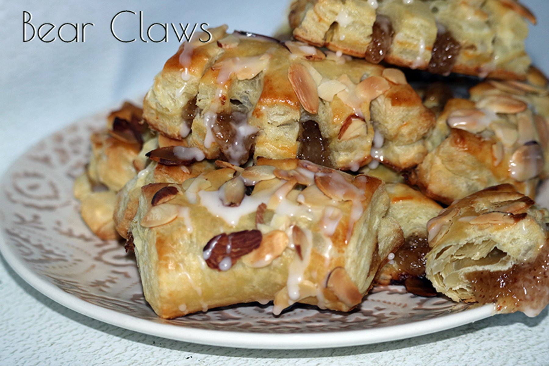 Bear Claws – a delicious almond filling wrapped up in a light puff pastry and garnished with sliced almonds and a drizzling of icing.