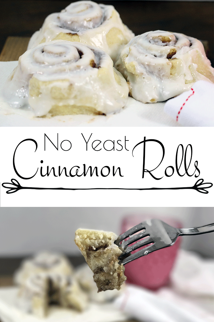 No Yeast Cinnamon Rolls – The easiest homemade cinnamon roll recipe you’ll ever need. No yeast; No dough-punching; No two-hour rise times; Simple, easy, cinnamon-y, gooey, need-a-fork-to-eat-it yummy goodness.
