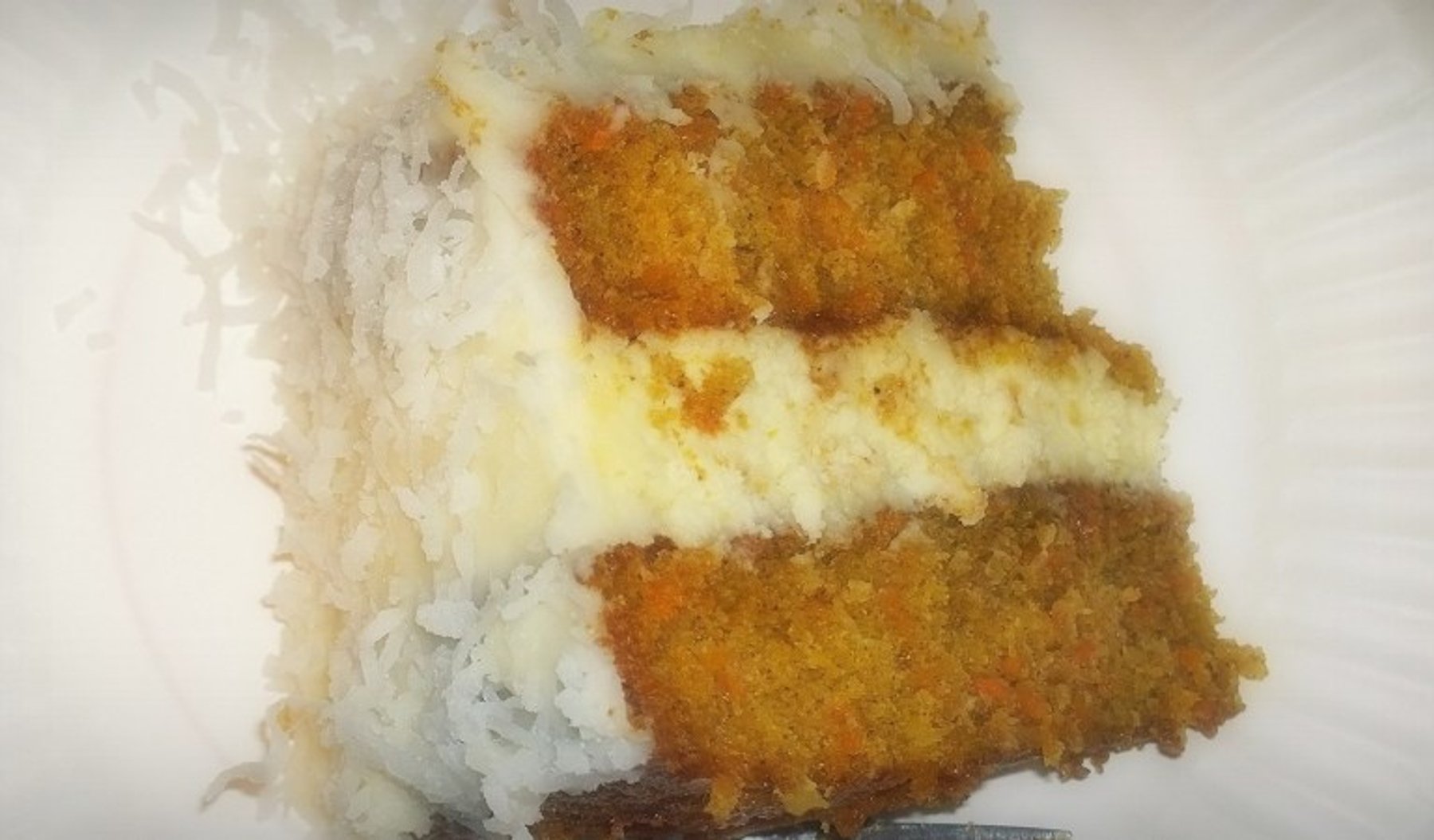 Moist carrot cake with a hidden cheesecake layered. We topped this with tangy cream cheese frosting and coconut.
