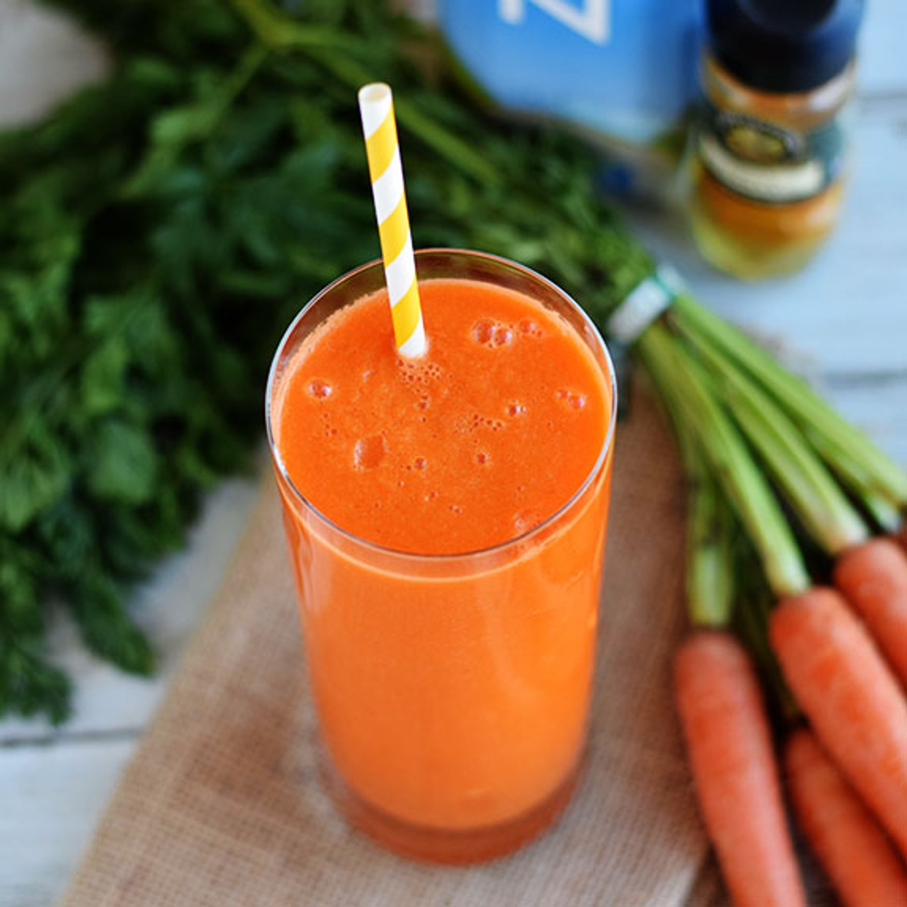 Mix all ingredients in a high-powered blender. If the smoothie is too thick add more coconut water. If it\\\'s too thin add another cube of ice or another carrot.