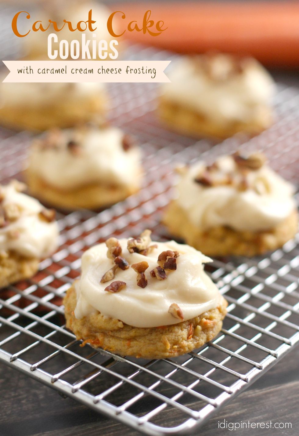 All the goodness of a moist, spice-infused carrot cake in a handheld, easy-to-make, on-the-go form, then these cookies are for you! Then, enjoy them plain or make them even more decadent, rich and completely irresistible by spreading them with Caramel Cream Cheese Frosting and sprinkling them with chopped pecans!