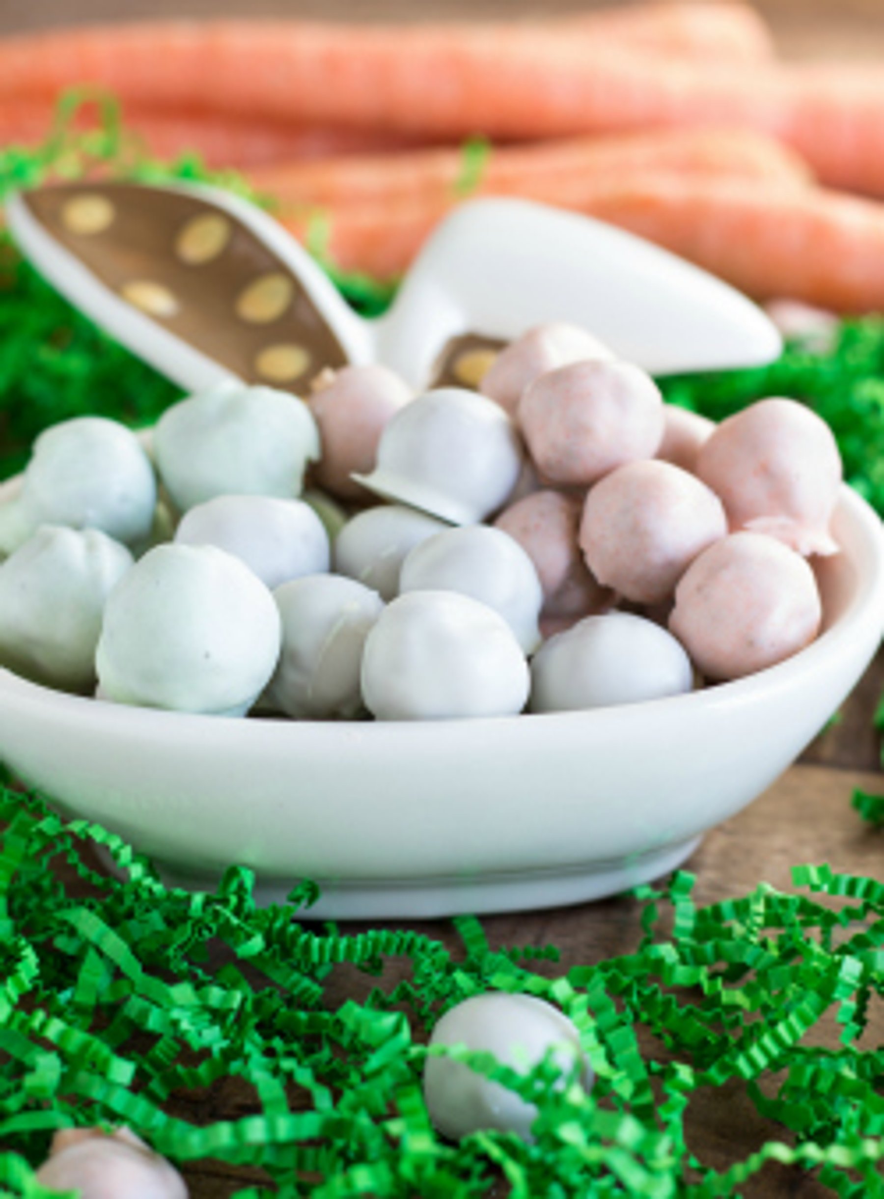 Miniature carrot cake balls mixed with cream cheese frosting and coated in a white chocolate coating. A copycat version of the Easter carrot cake M&M’s.