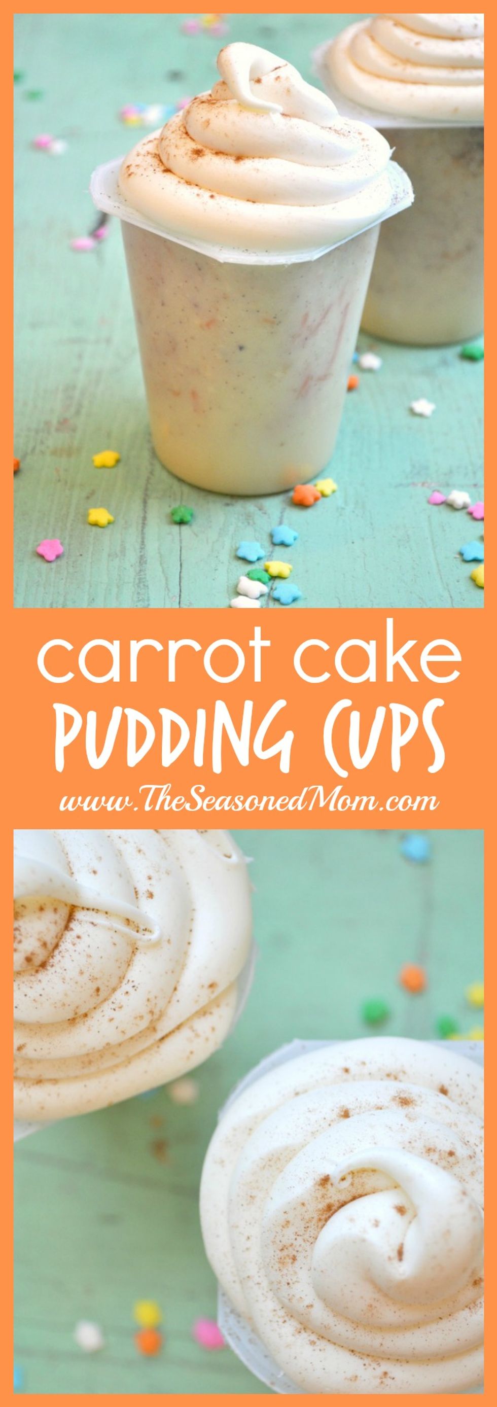 A creamy vanilla Snack Pack gets spiffed up for Easter in these Carrot Cake Pudding Cups! Spices, raisins, carrots, and cookie crumbs are all stirred into the mix and finished off with cream cheese frosting. These sweet little treats are a quick, easy, and delicious way to celebrate spring!