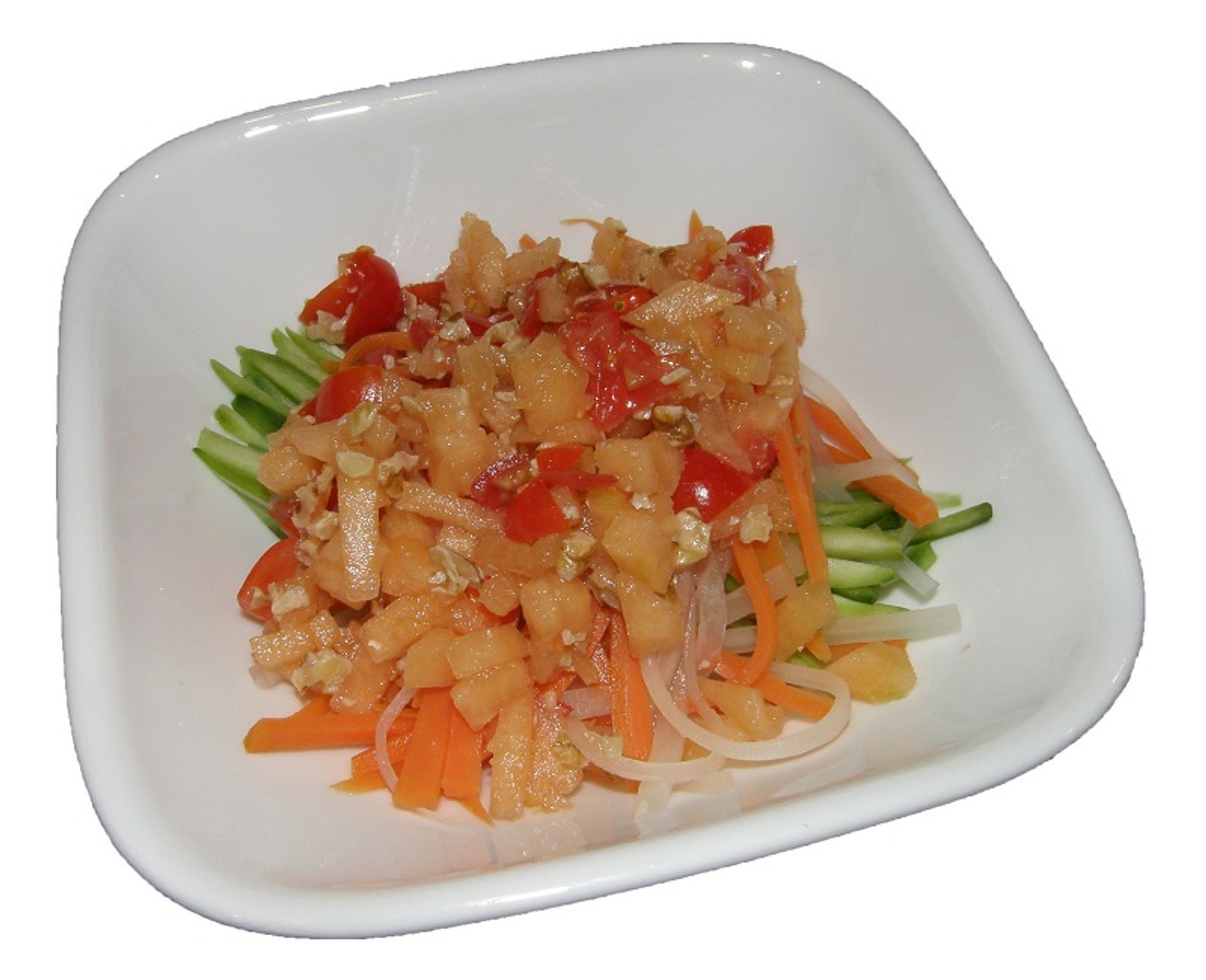 “Noodle” salad made from vegetables, with a fruit-based sauce.