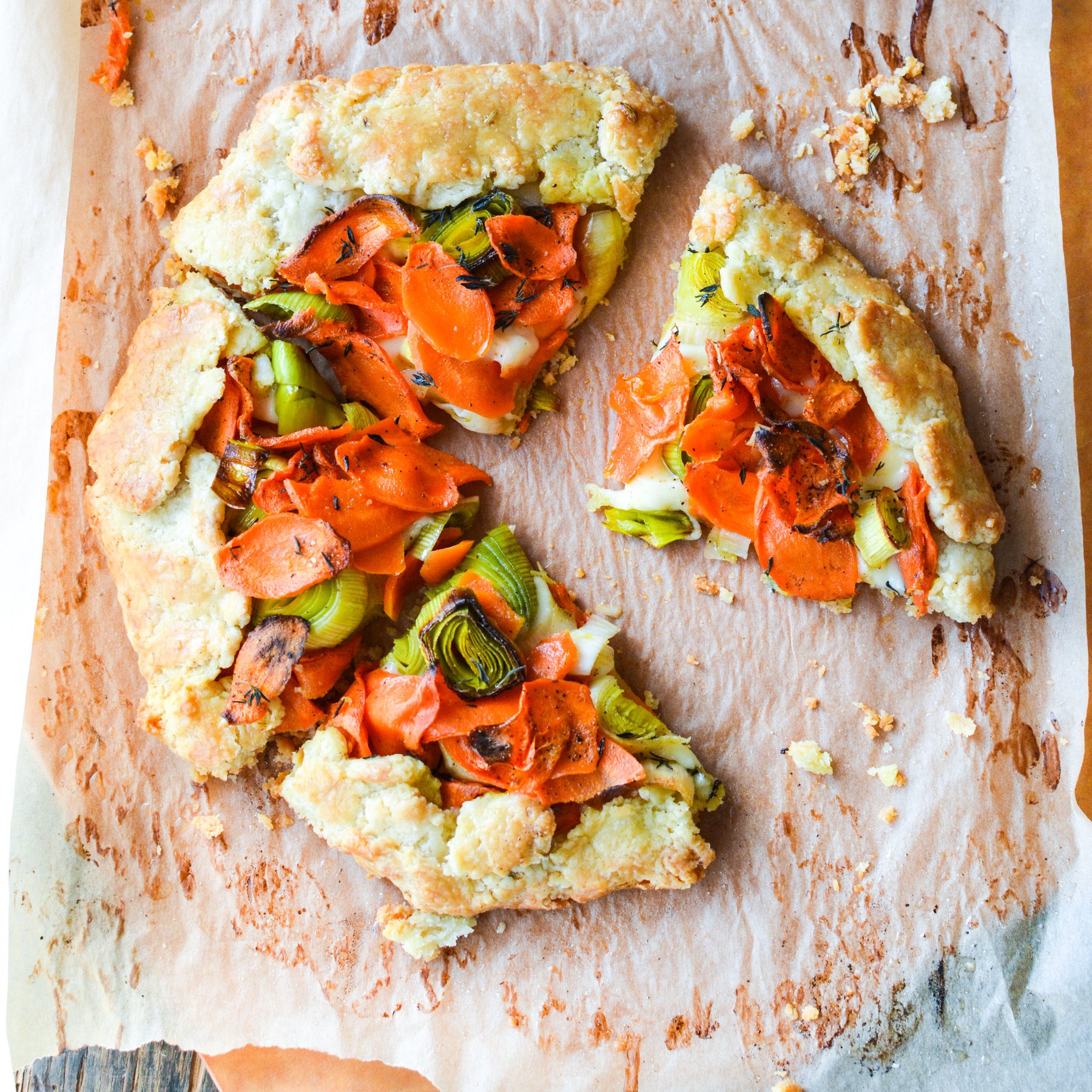 Fontal cheese is topped with fresh thyme, thinly sliced roasted carrots and leeks all surrounded by a buttery, fennel crust in this rustic galette recipe