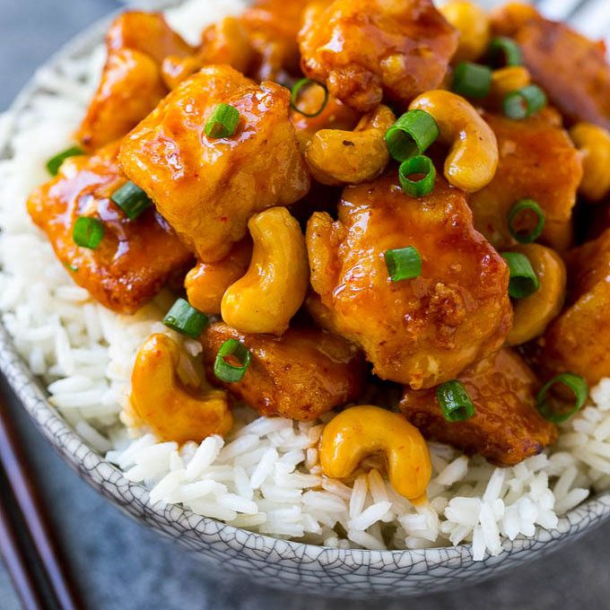 This cashew chicken is chunks of crispy chicken and roasted cashews tossed in a sweet and savory sauce. Serve over rice for the perfect easy dinner option!