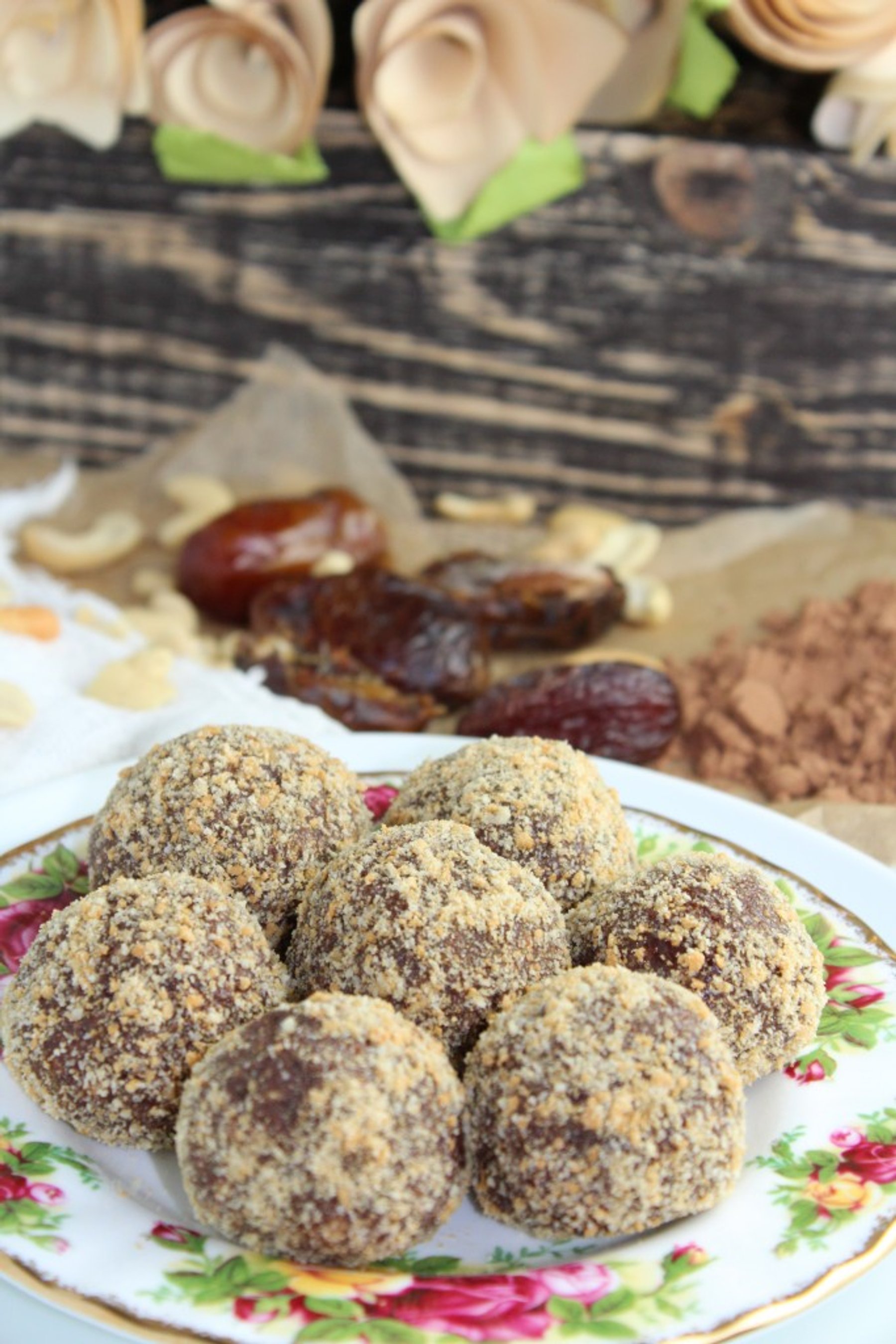 These delicious truffles deliver an unmistakably decadent taste of chocolate, but they are a protein power house, vegan, sugar-free and loaded with good for you ingredients like nuts, chia seeds and oats. I used dates and maple syrup for a sweet, brown sugar like taste. A guilt free indulgence!