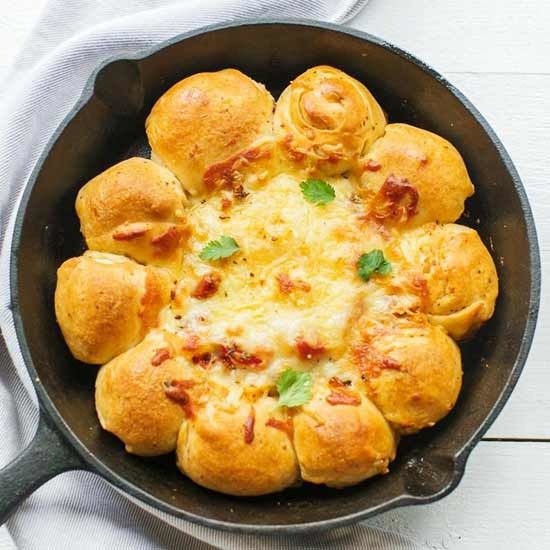This cast iron pizza bread with mozzarella dip is a great recipe to make when you have guests and want to serve something different. It is made with pizza dough, garlic butter, tomato mix and mozzarella cheese.