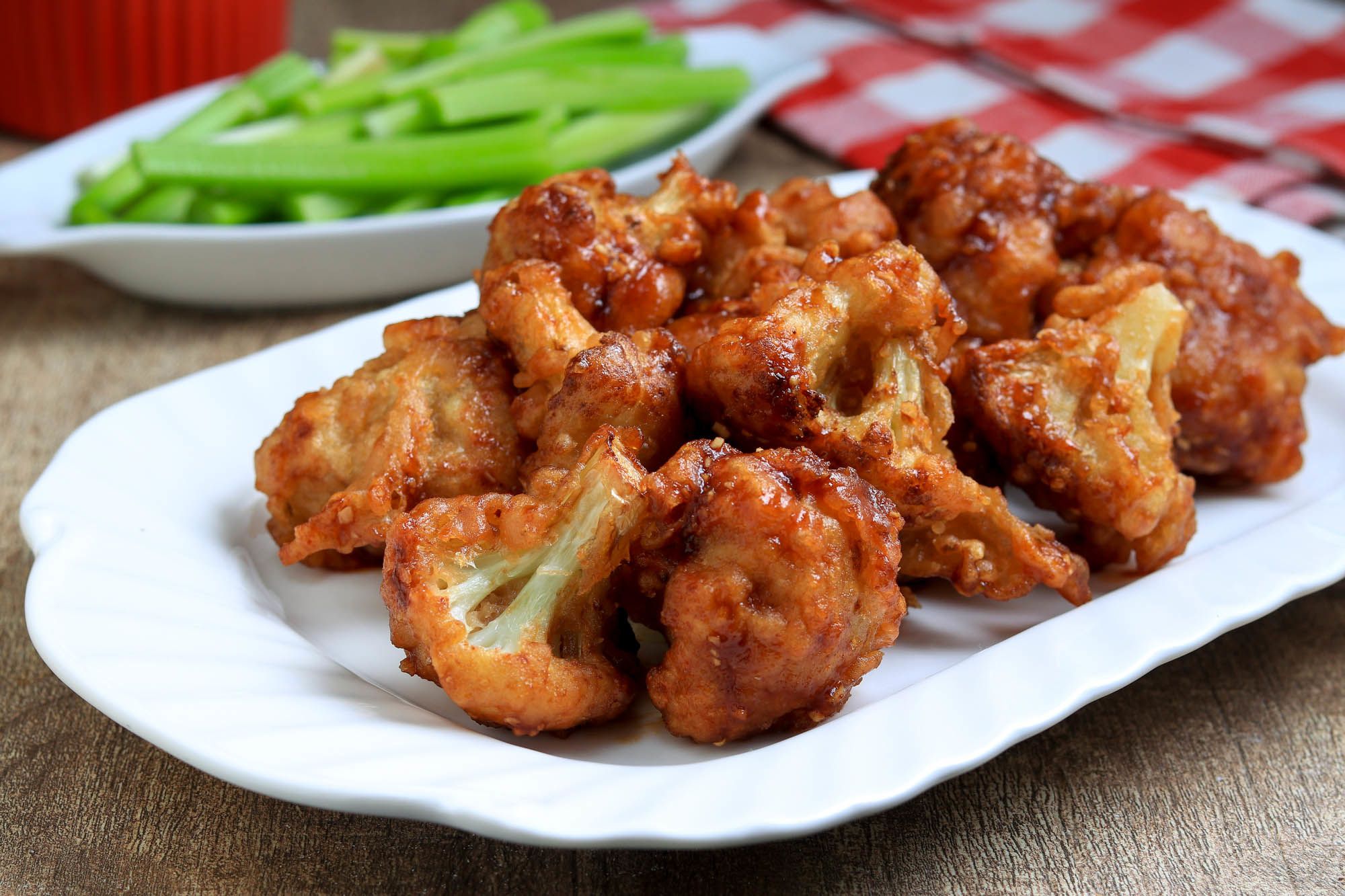 Cauliflower makes a perfect substitute for golden chicken wings in this healthier version of an all-time favorite.