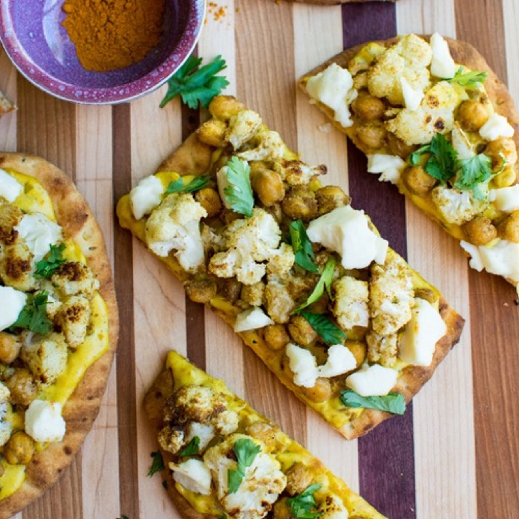 Toasted naan topped with homemade curry, cumin and coriander spiced roasted cauliflower and chickpeas, and paneer!