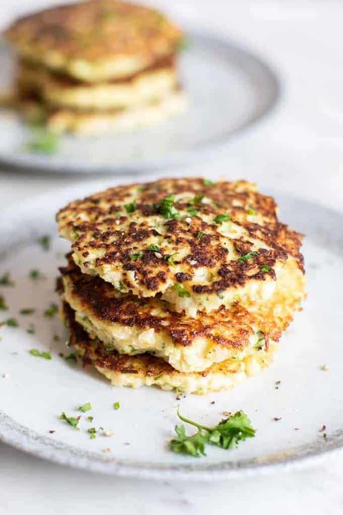 Crispy brown, lightly fried low carb cauliflower fritters make a great breakfast! This easy method produces fritters that crisp up perfectly. Flourless and keto cauliflower fritters.