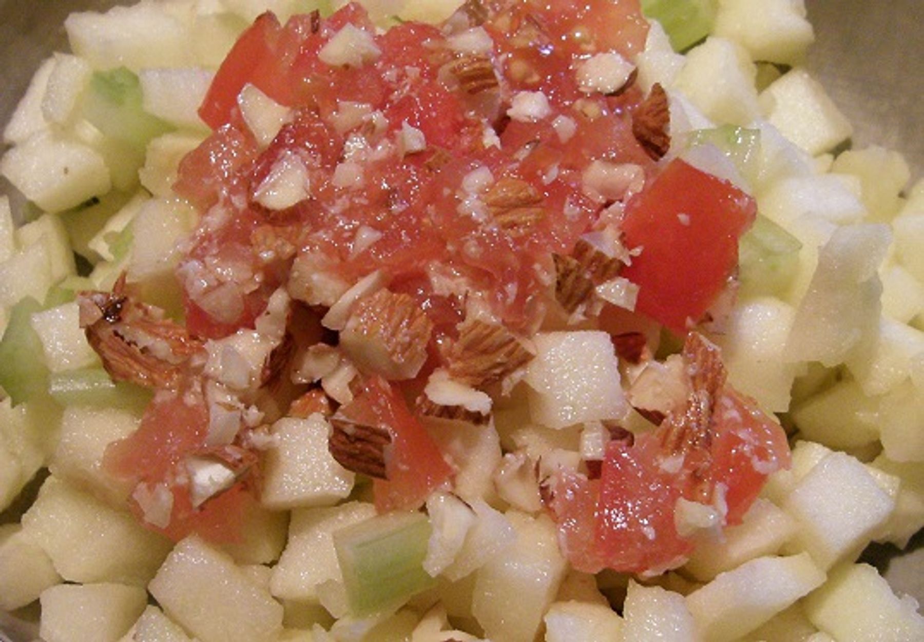 Mix walnut, tomato and lemon juice separately, then pour over the celery-apple mixture.