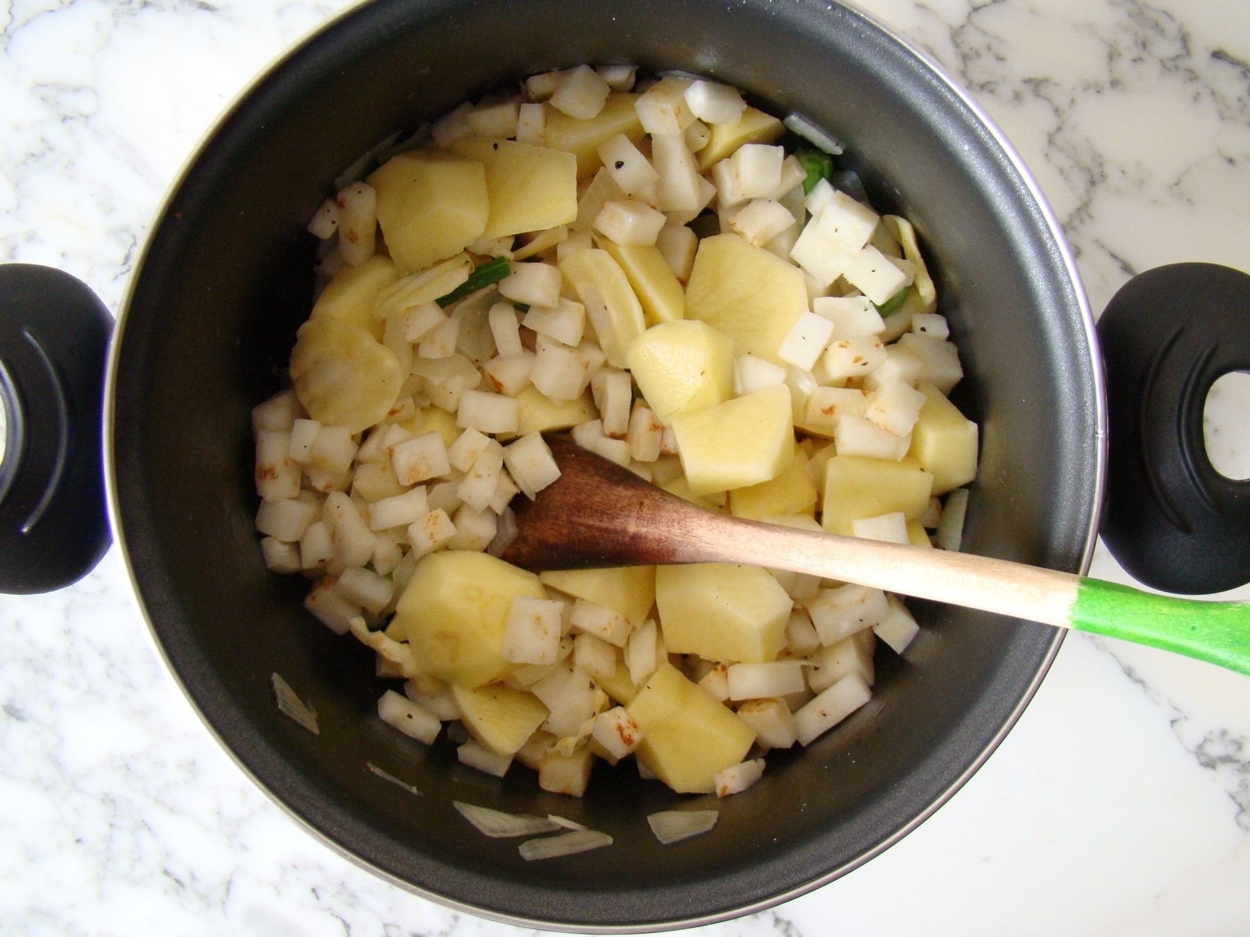 Carefully peel the celery root and cut it into little cubes. Chop the onion and the celery stalk. Heat 1 tablespoon of olive oil and saute the onion and celery for 7-8 minutes.