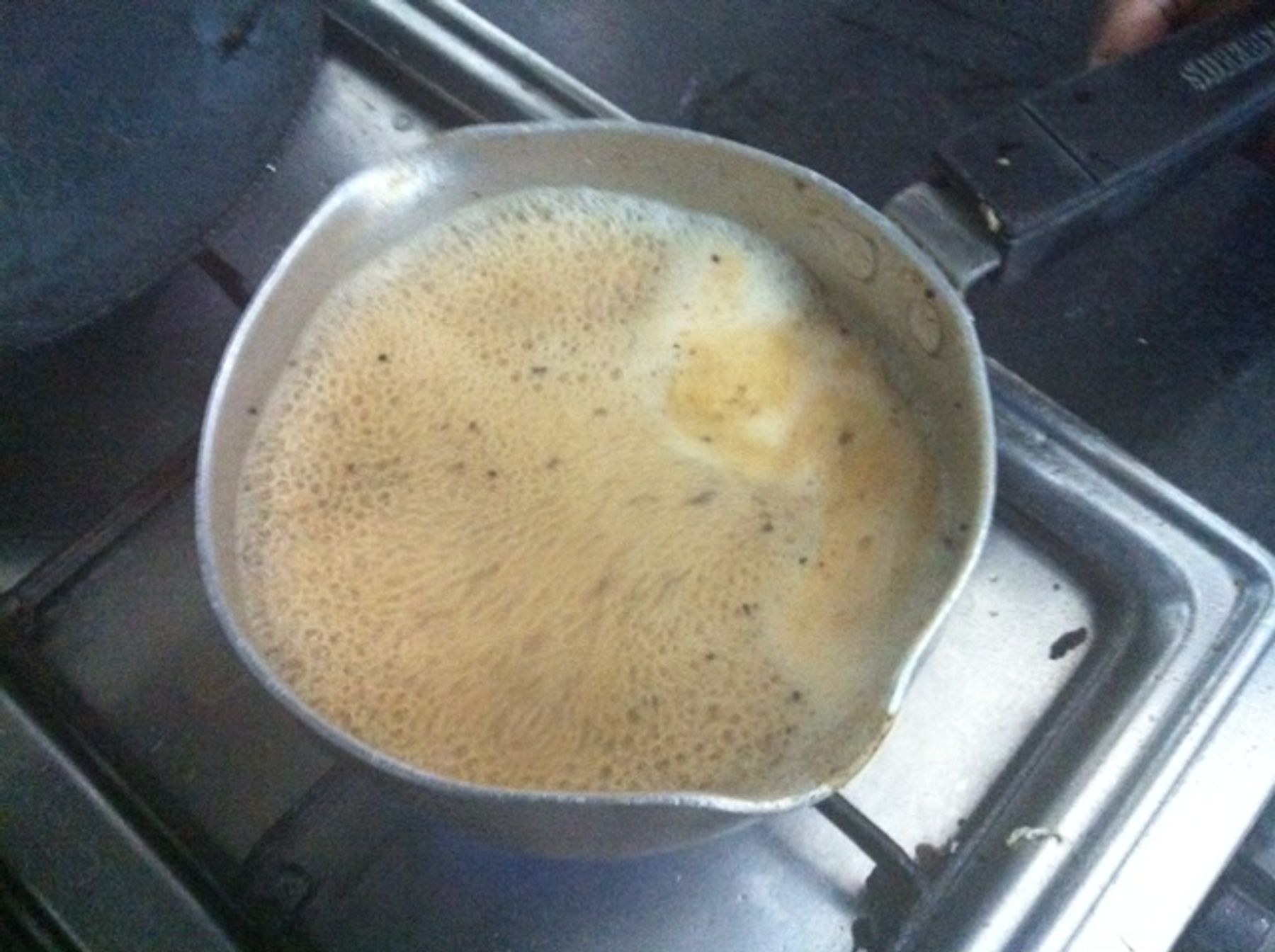 Crush some fresh ginger. About half a stick should be enough. Bring 1.5 cups of water to a boil.