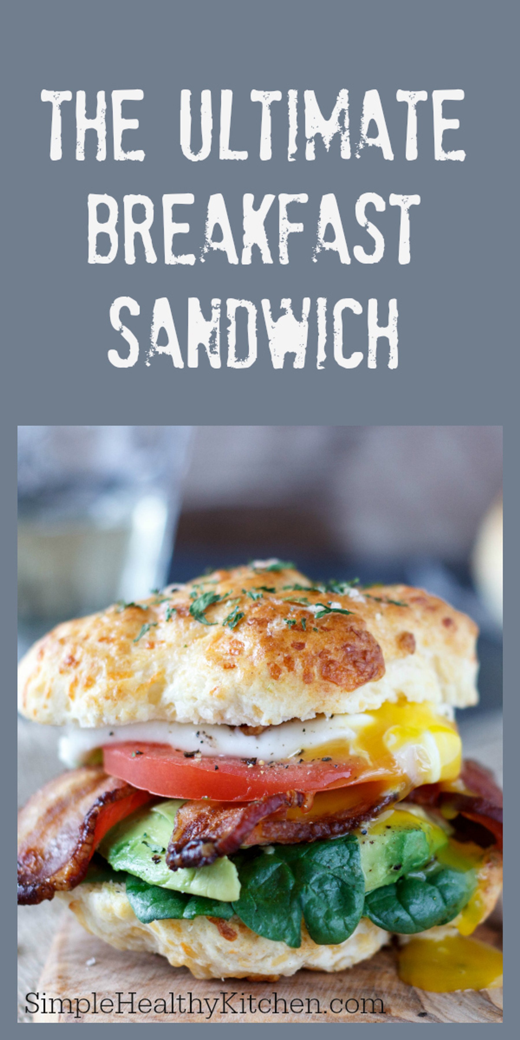 Fresh baked cheddar bay biscuits (low-fat and ready in 15 min.) take this breakfast sandwich to a whole new level! Topped with a poached egg , crispy bacon and healthy veggies like spinach, avocado and tomato, now that’s a good way to start the day!
