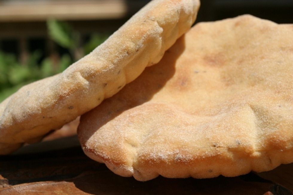 Homemade pita bread flavored with cheddar cheese, green onion and Ajwain seeds