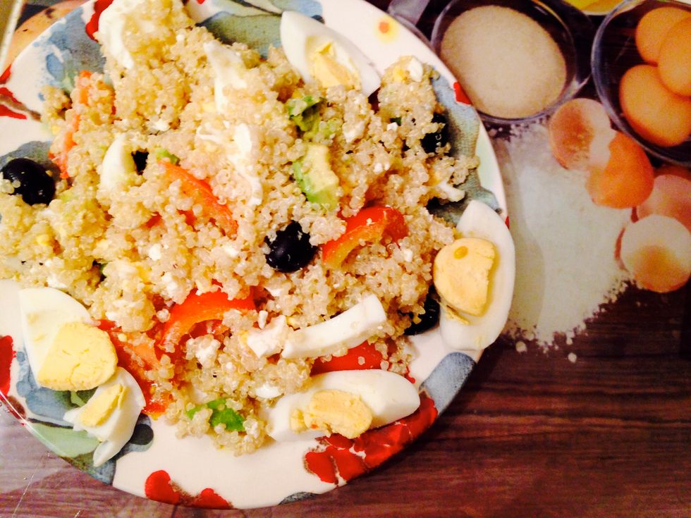 Hearty quinoa salad with eggs, feta cheese, avocado, tomatoes and olives.