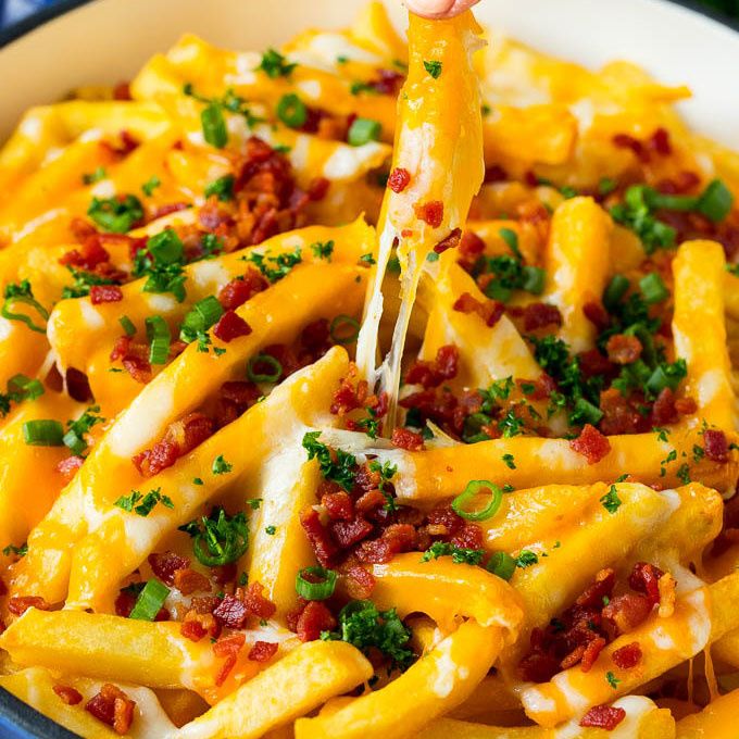 These cheese fries are crispy french fries topped two types of melted cheese, smoky bacon and fresh herbs. A hearty appetizer option that takes just minutes to put together and is always a big hit!
