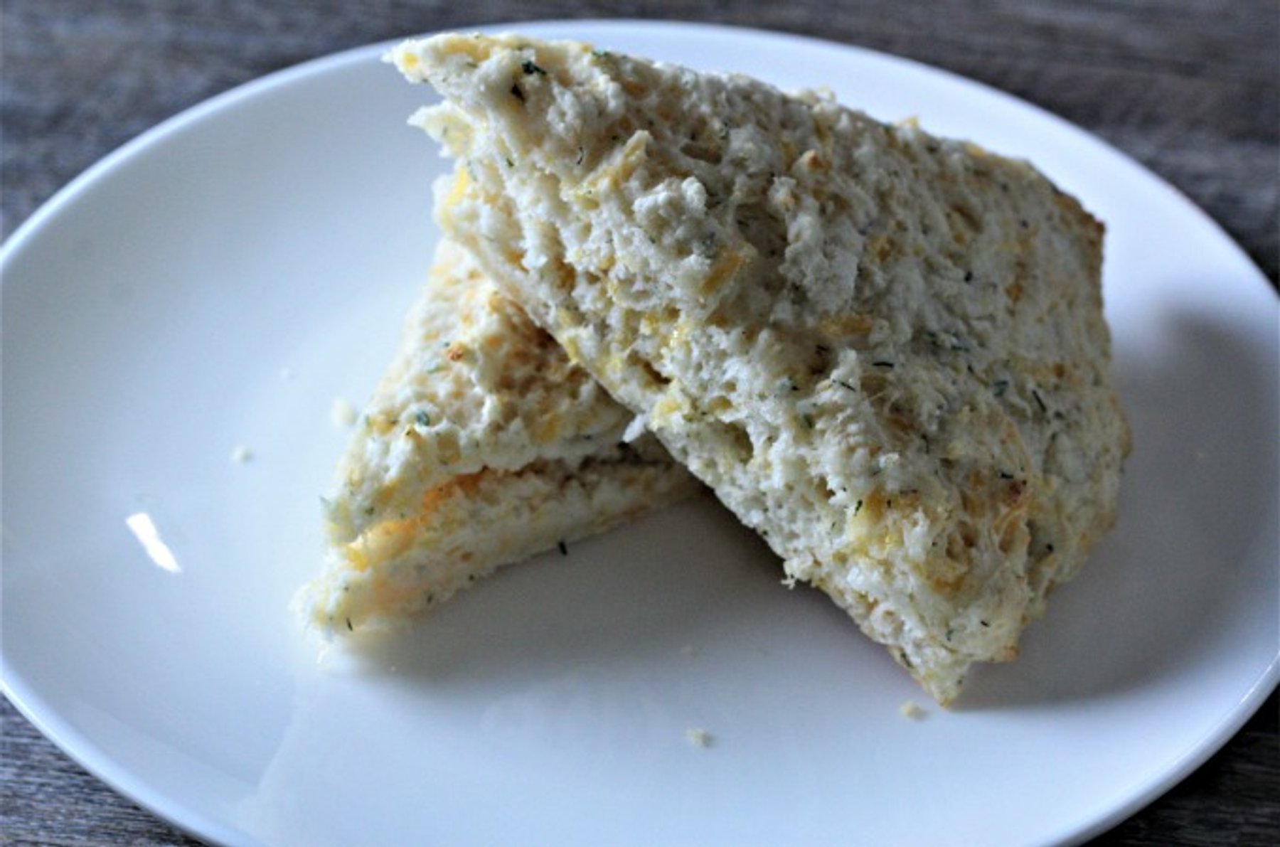 Cheese & Herbs Scones {Heart Smart} combine Bisquick, an egg, Greek yogurt, cheddar cheese, and dried herbs to make a fast and healthy addition to a meal.