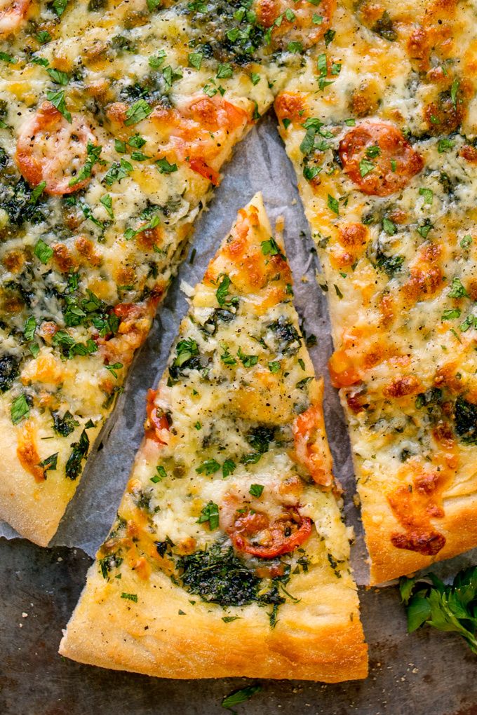 Homemade Cheese and Tomato Garlic Pizza Bread – a crisp dough with that perfect chewy interior, loaded with garlic, tomatoes and two types of cheese!