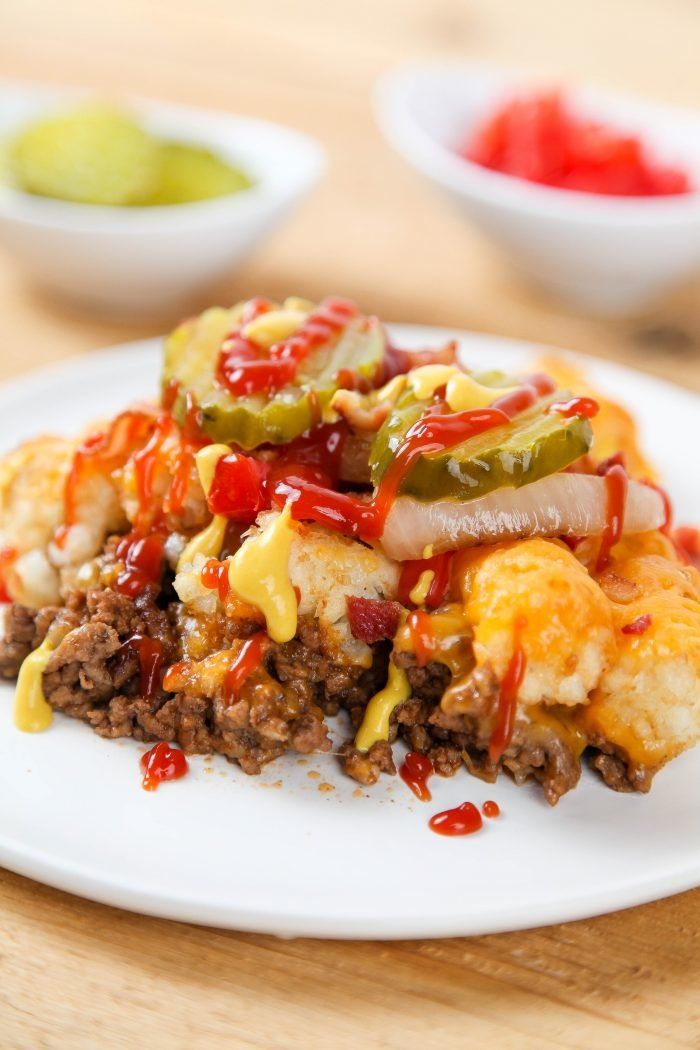 Cheeseburger Tater Tot Casserole: Crunchy tater tots and gooey cheese come together in this easy casserole. Tastes just like a cheeseburger and fries without all the work!